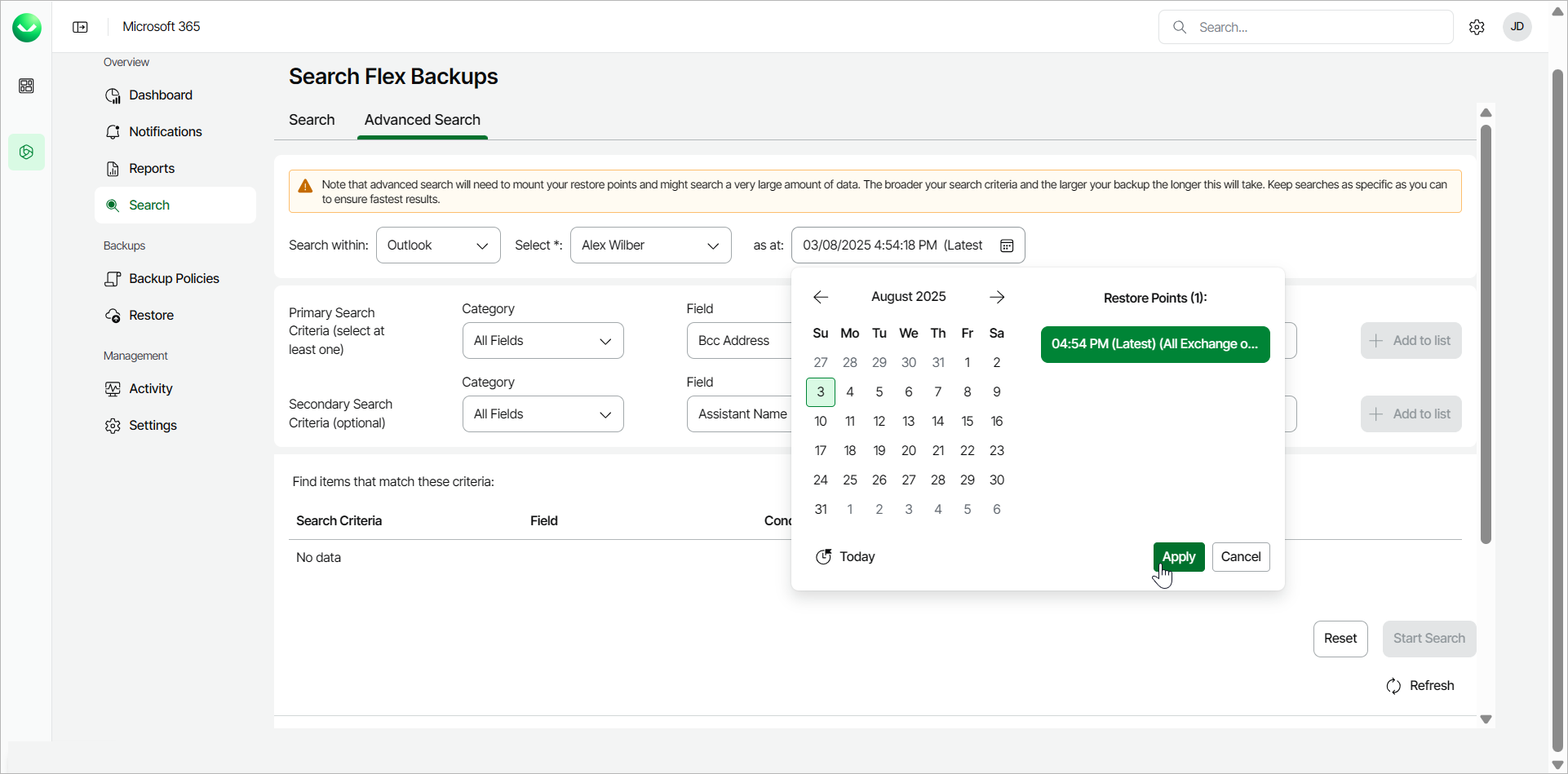 - In the Restore Point field, select a restore point where you want to search for backed-up items and click Apply. The restore point defines the date and time when the backup was created.