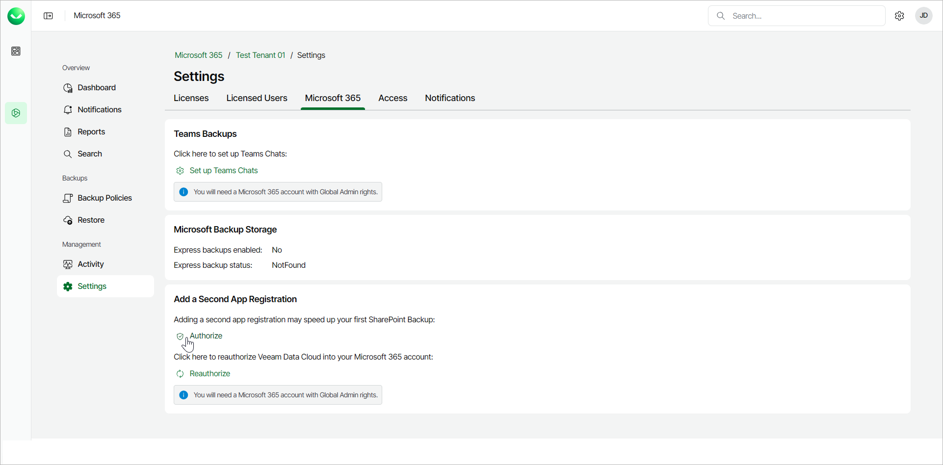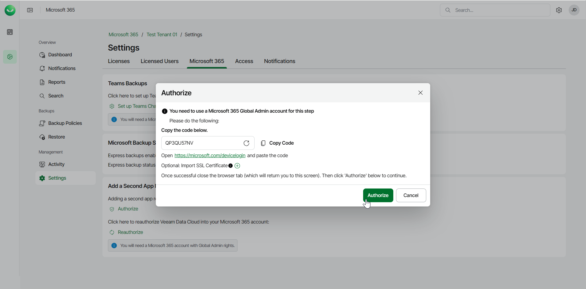 - In Veeam Data Cloud for Microsoft 365, click Authorize.
