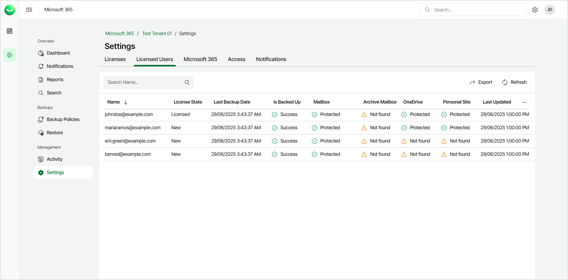 In the table with your current Veeam Data Cloud for Microsoft 365 licensed users, the following information is displayed: