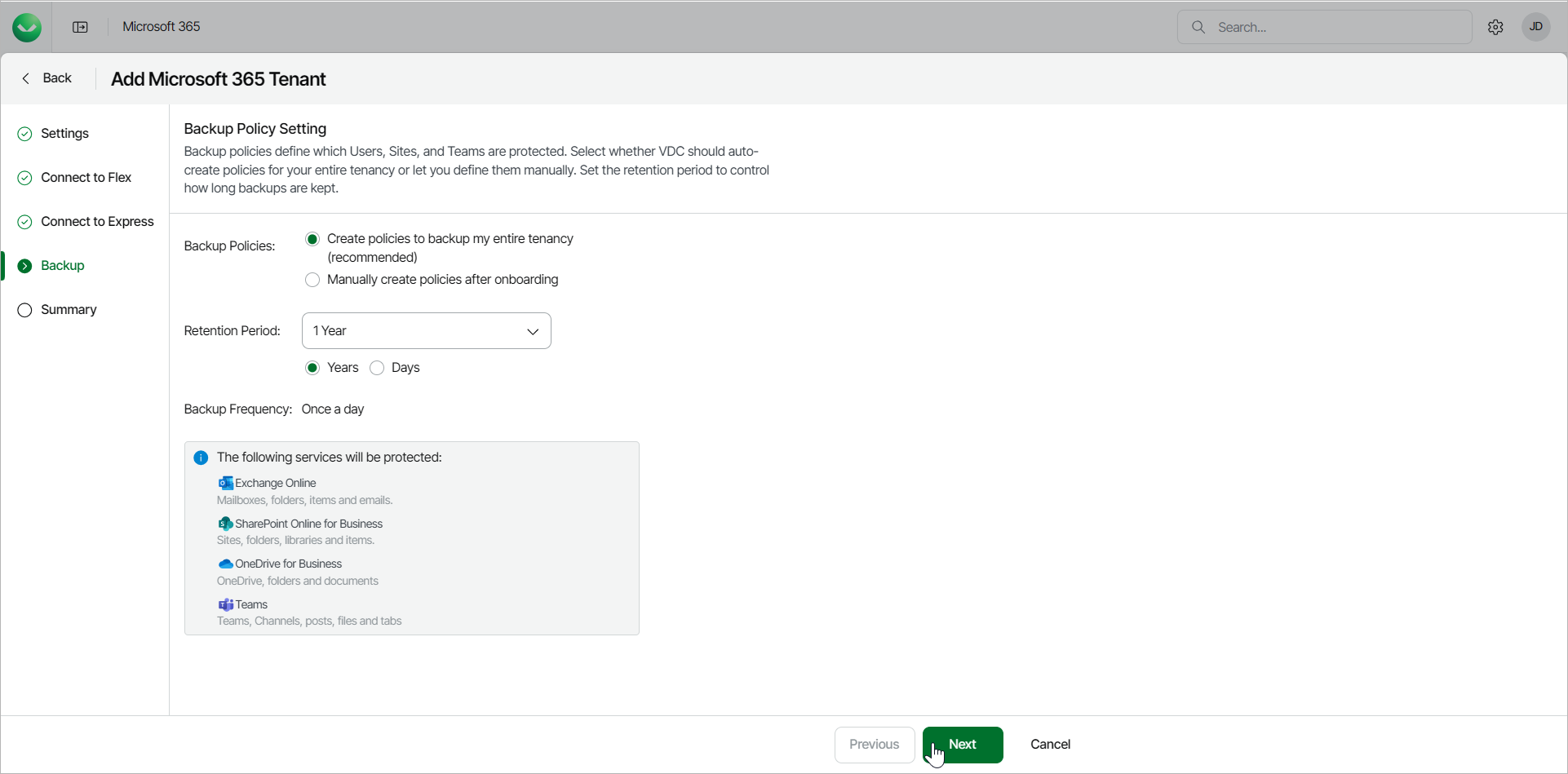 - Create policies to back up my entire tenancy. This option is recommended and enables automatic backup policies for all users, sites and teams.