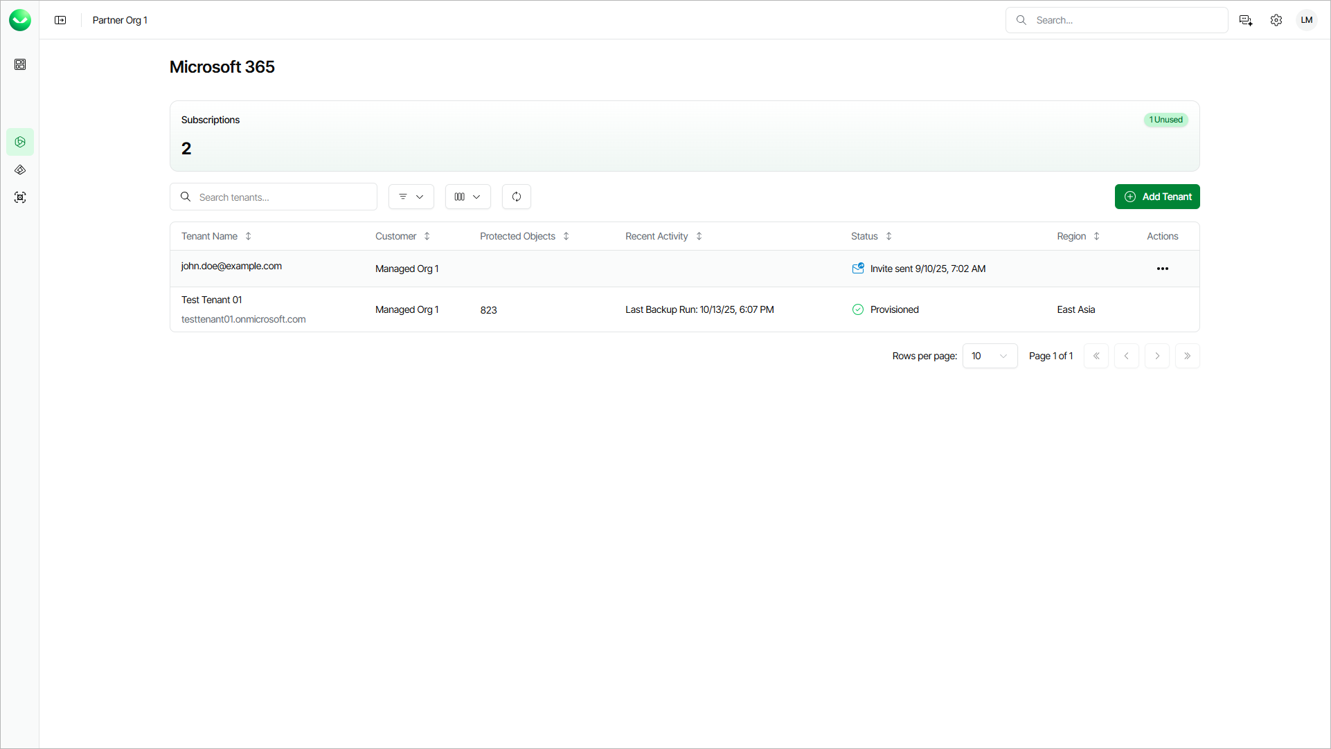 Tenant Name | The name that you specified when adding the tenant and the primary domain name of the Microsoft 365 tenancy where this Veeam Data Cloud for Microsoft 365 tenant is connected. If the tenant status is Invite Sent, this property shows the email address to which you sent the invitation. |