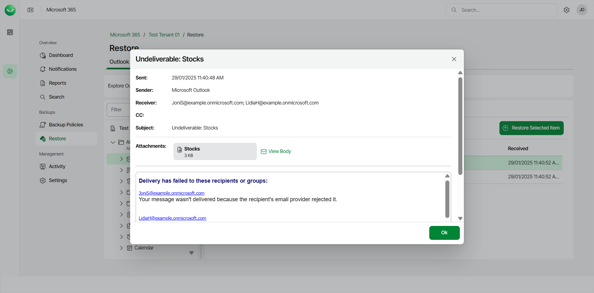 - The email contents will open in a new window. Veeam Data Cloud displays the following information: