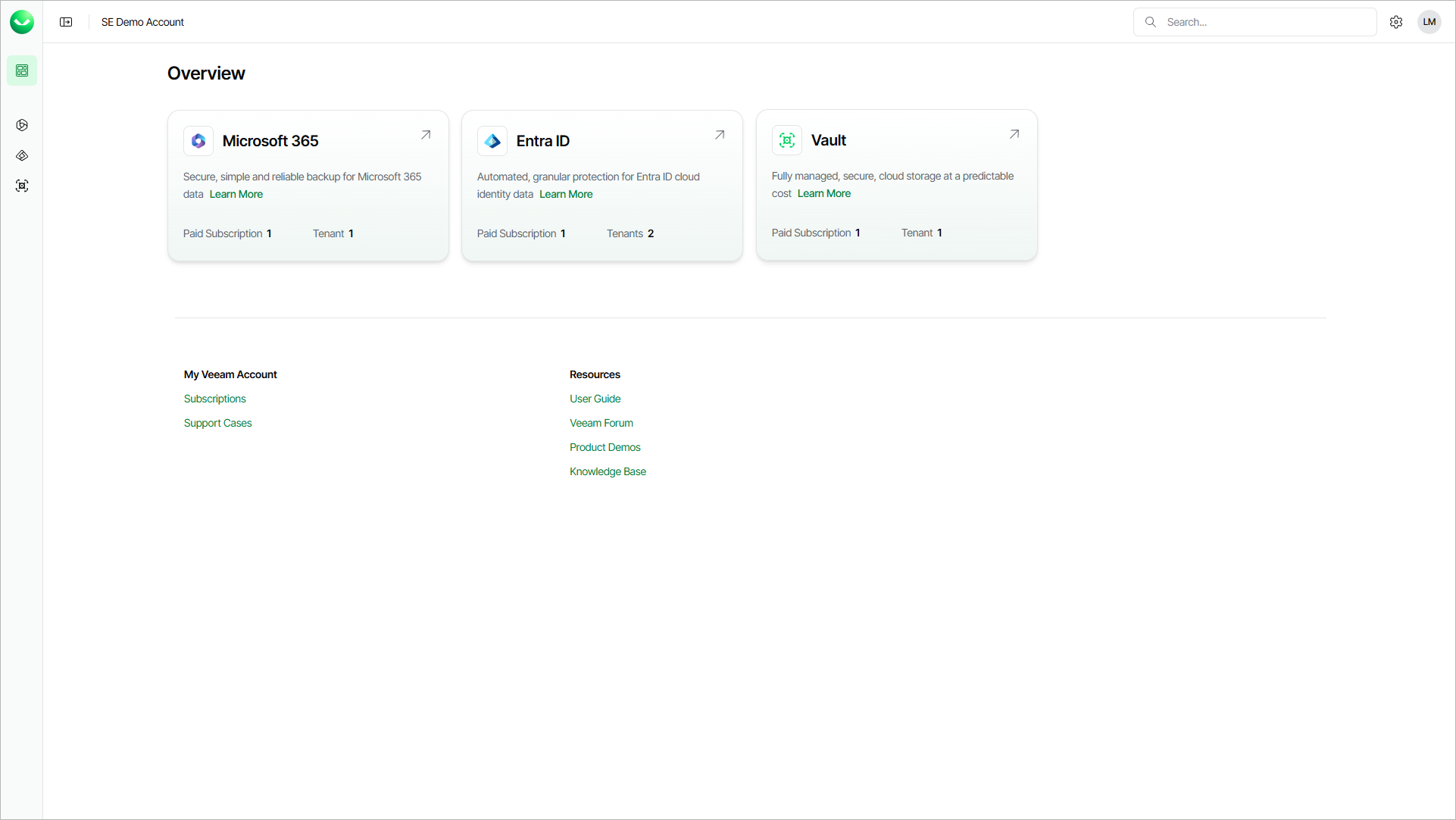 Overview is the landing page every time you log in. For details, see Accessing Veeam Data Cloud. To return to the Overview page from a different page, click the overview icon or the Veeam Data Cloud logo in the upper-left corner.
