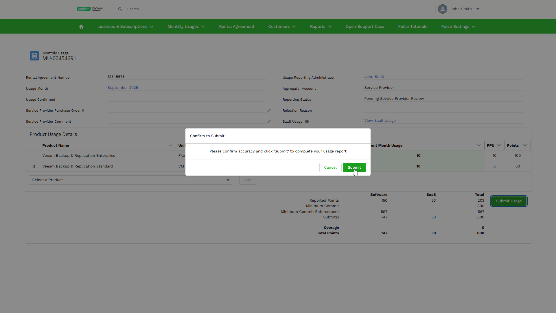 - To submit the report to your Veeam Aggregator, in the Confirm to Submit window, click Submit.