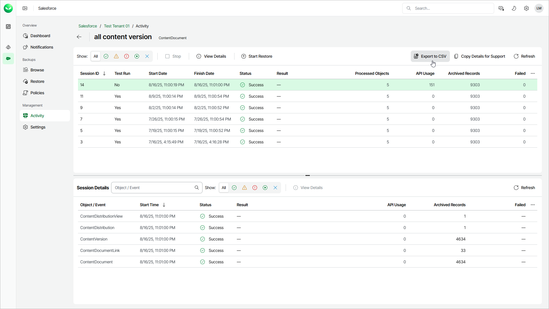 - On the Data Archival Sessions tab, click the status link of a policy.