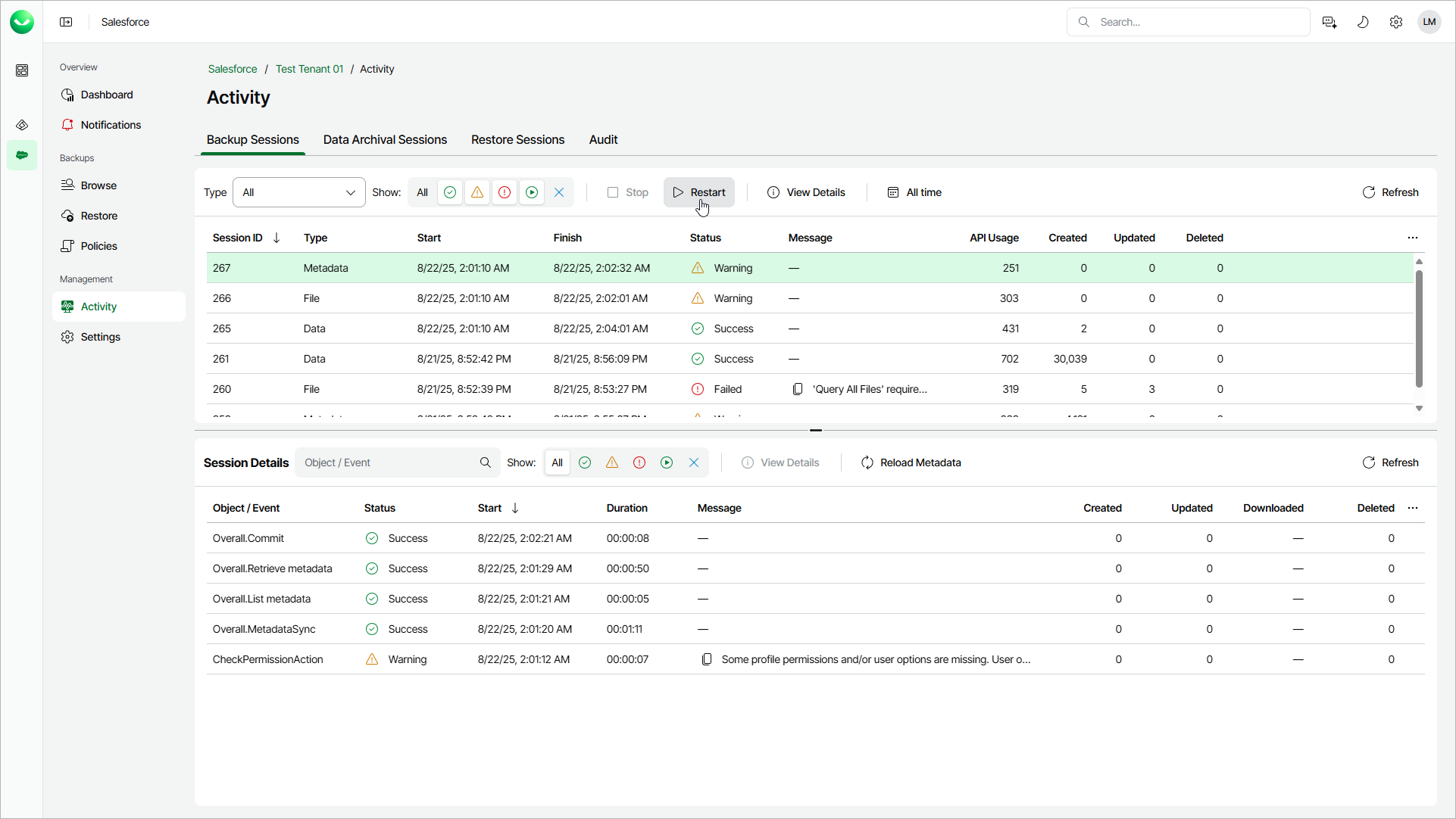 - Click Graceful Stop to complete backup for Salesforce objects that are already being processed by the backup session. Veeam Data Cloud will stop the policy execution when backup of the processed objects is finished, and the backup session will acquire the Stopped status.