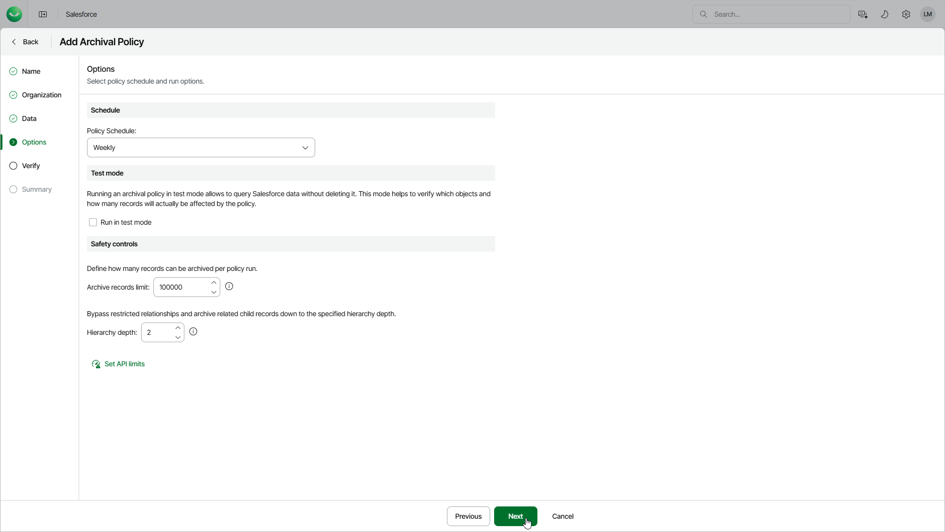 At the Options step of the wizard, you can select an archival schedule, specify API request and safety control limits and run the policy in the test mode.