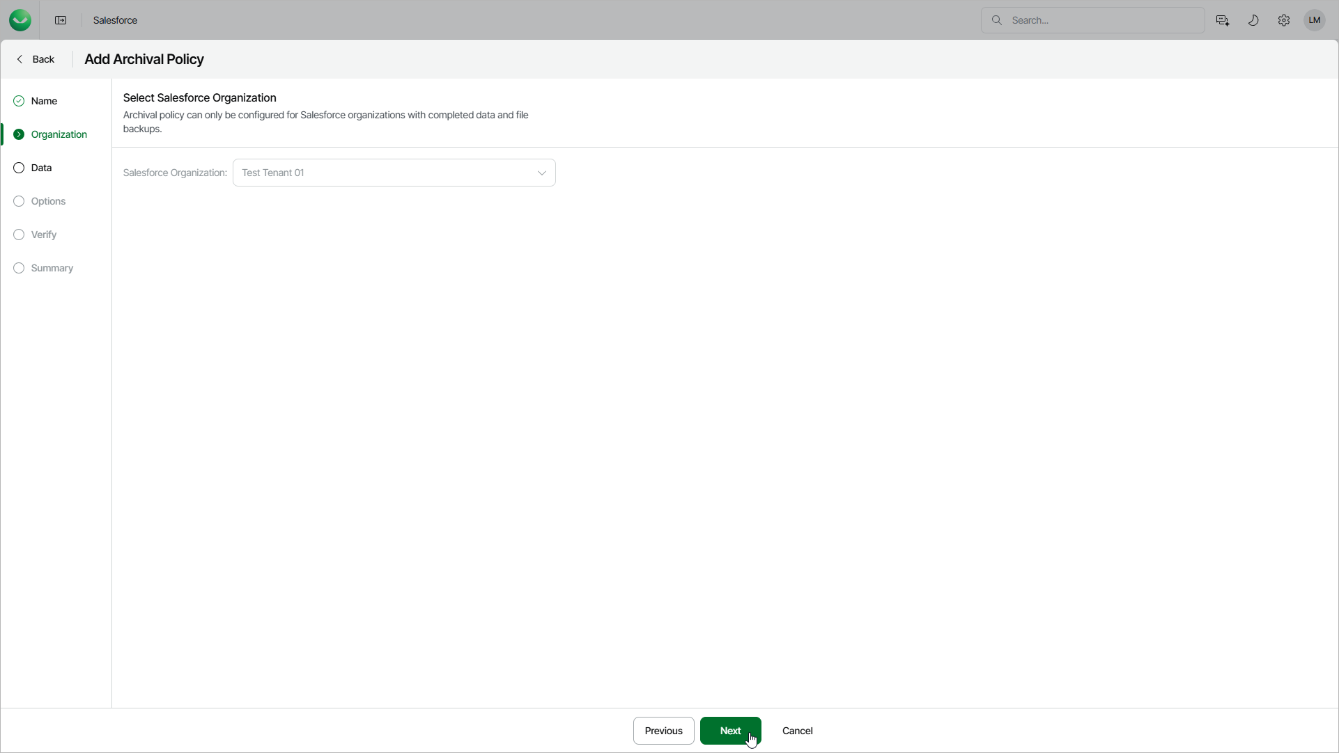 Step 3. Verify Organization At the Organization step of the wizard, you can check the Salesforce tenant for which you are creating the policy.
