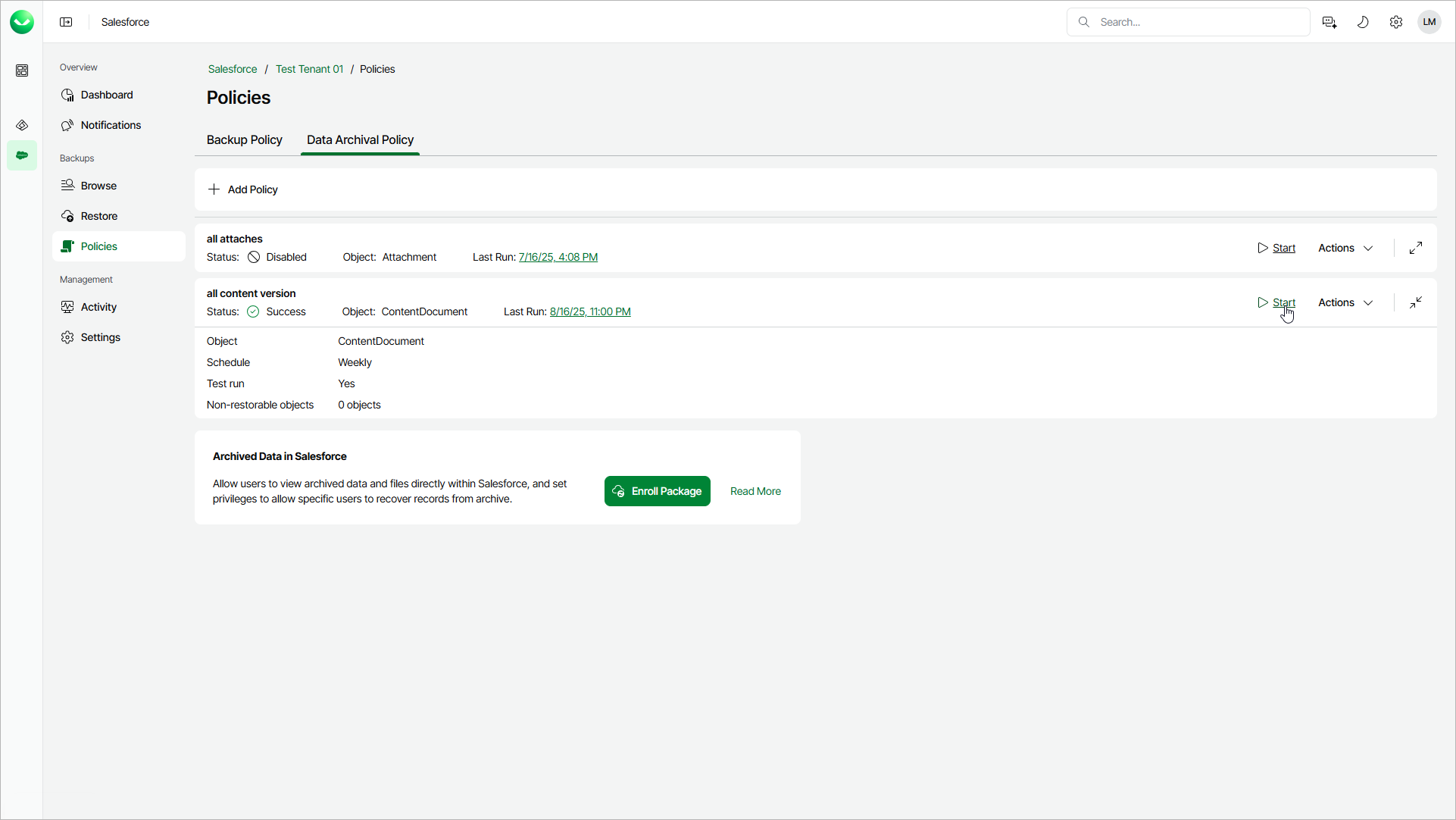- On the Data Archival Policy tab, find the policy you need and click Start.
