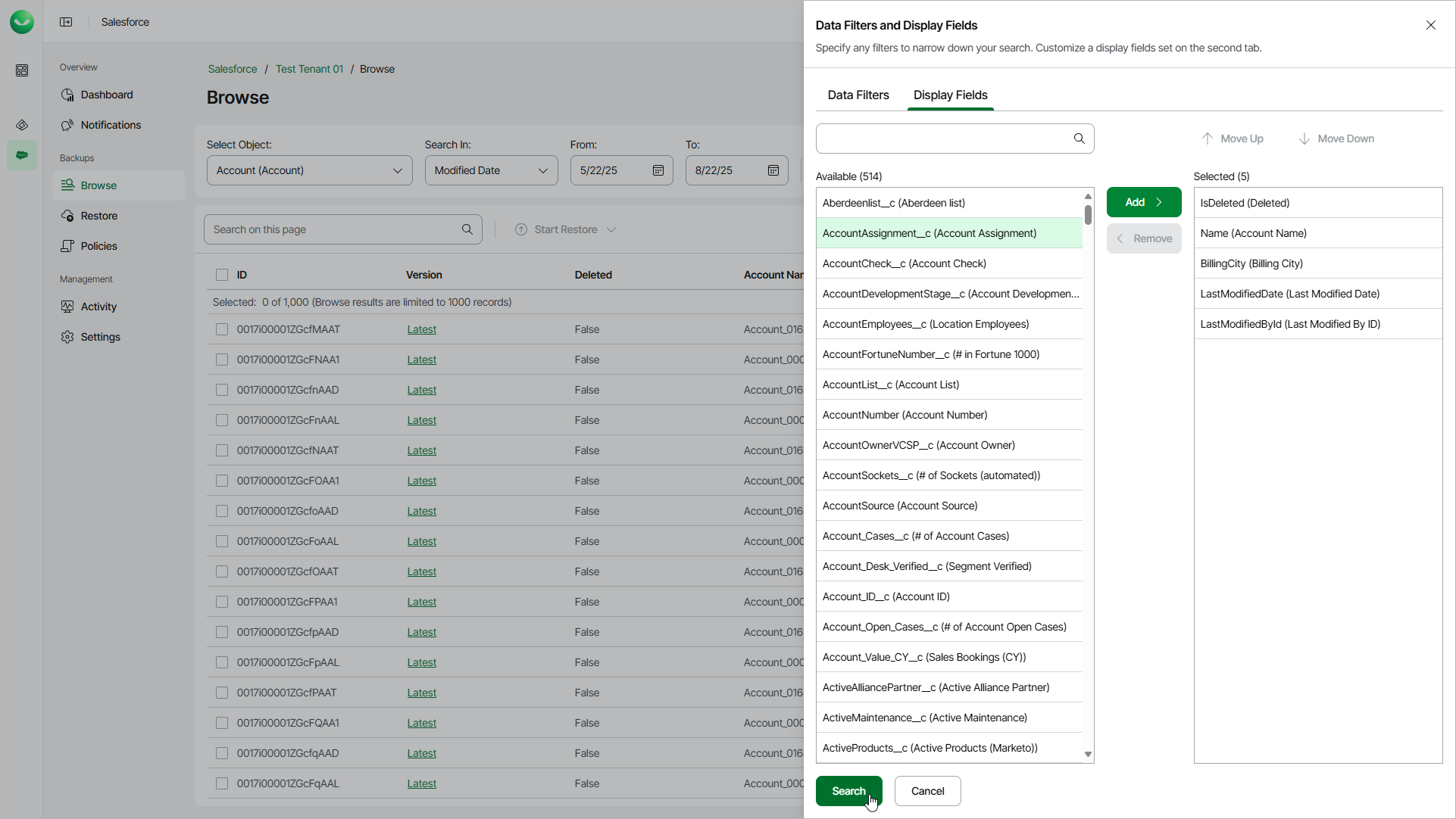 To choose the field that you want to display, click the filter icon, select the Display Fields tab and select the necessary fields. Veeam Data Cloud saves your settings and will use them when you restore or browse backed-up data. To reset these settings, clear your browser cookies.