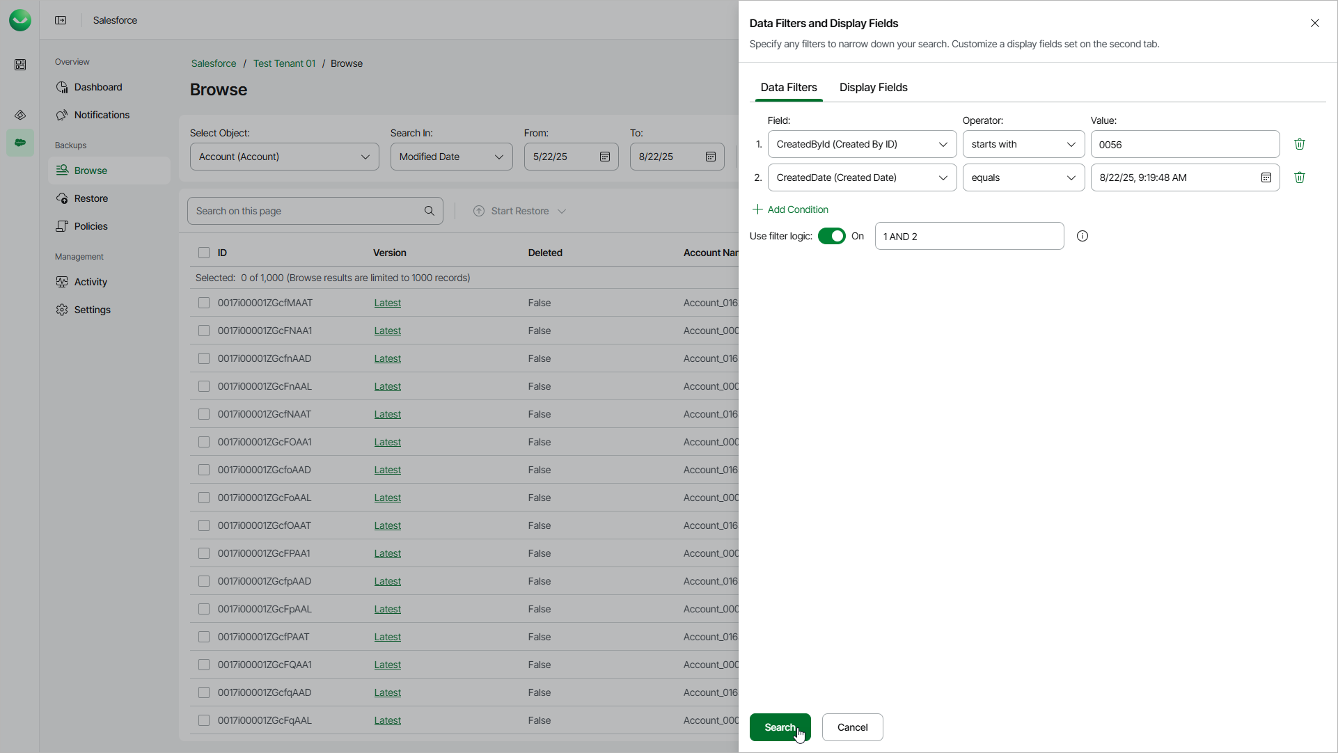When you browse Salesforce backups, Veeam Data Cloud displays the maximum number of 1000 records per page. If you want to apply specific search conditions and reduce the number of search results, or if you want to select specific Salesforce fields to be displayed in the search results, you can configure data filters.