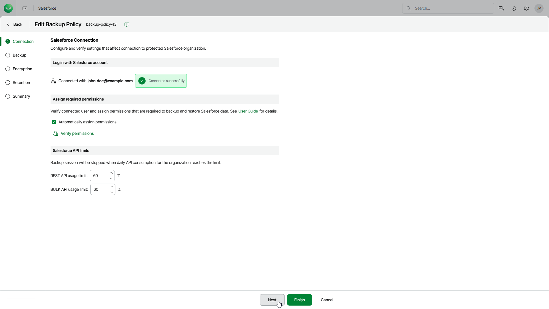 At the Connection step of the wizard, you can verify user permissions and modify the limits for API calls sent by Veeam Data Cloud to Salesforce.