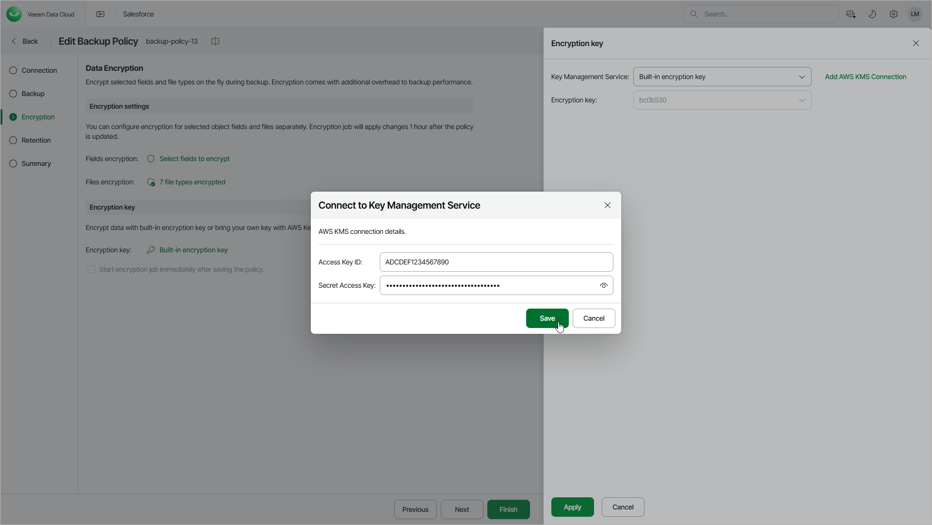 Veeam Data Cloud encrypts backed-up fields and files and can extend Salesforce Shield Platform Encryption to secure sensitive data stored in backups from bad actors. For more details on Shield Platform Encryption, see Salesforce Documentation. To encrypt data, Veeam Data Cloud uses data key that is enciphered with either a Veeam Data Cloud master key or an Amazon Web Services Key Management Service (AWS KMS) master key. The Veeam Data Cloud master key is configured as a default option to encrypt all file types and the object fields that you select to encrypt.