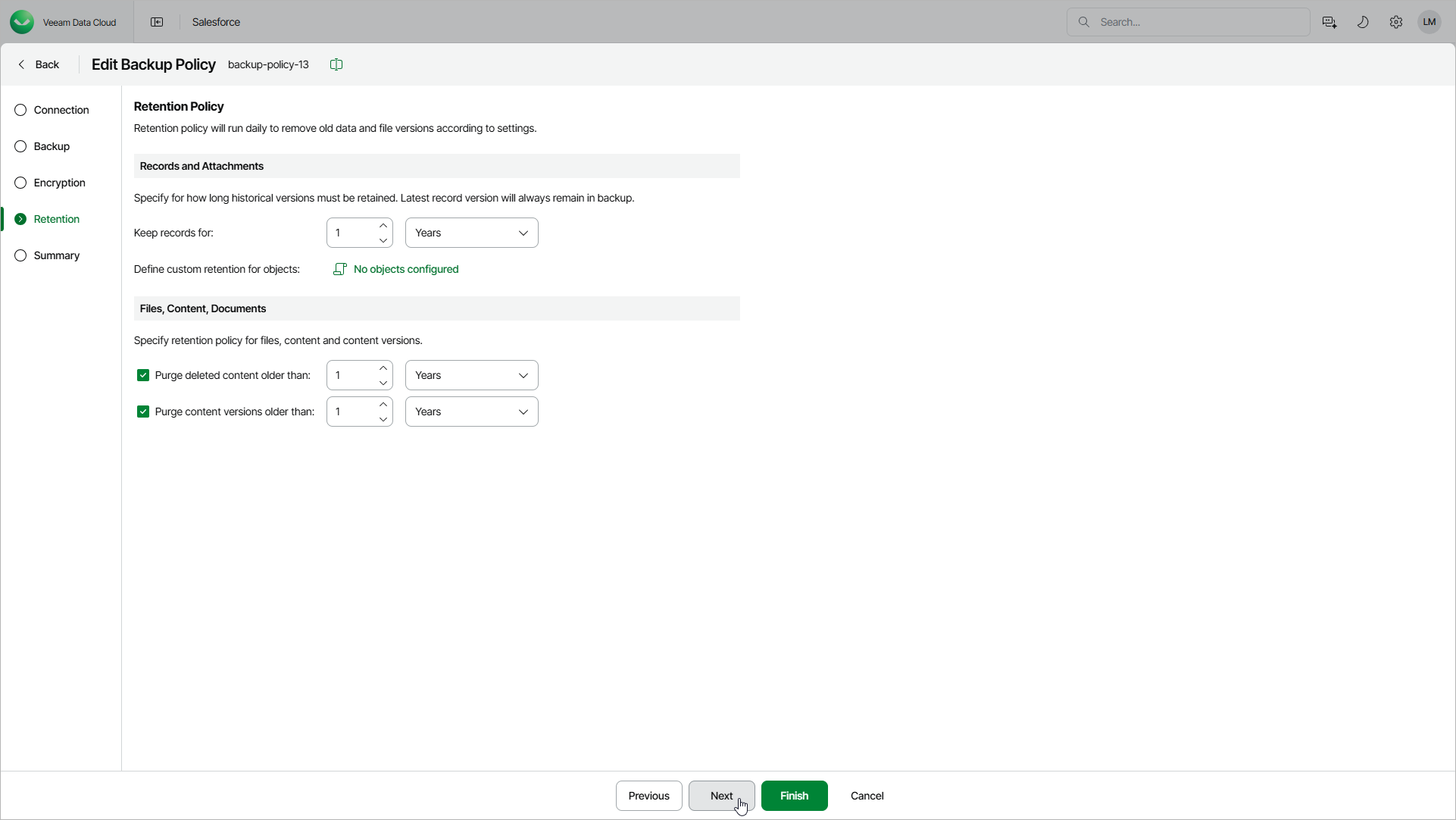- The settings specified in the Data and attachments retention policy section do not apply to backups of files, content and documents created by the policy. If you want Veeam Data Cloud to automatically delete these backups according to the retention policy, configure their own retention settings in the Files, Content, Documents section: