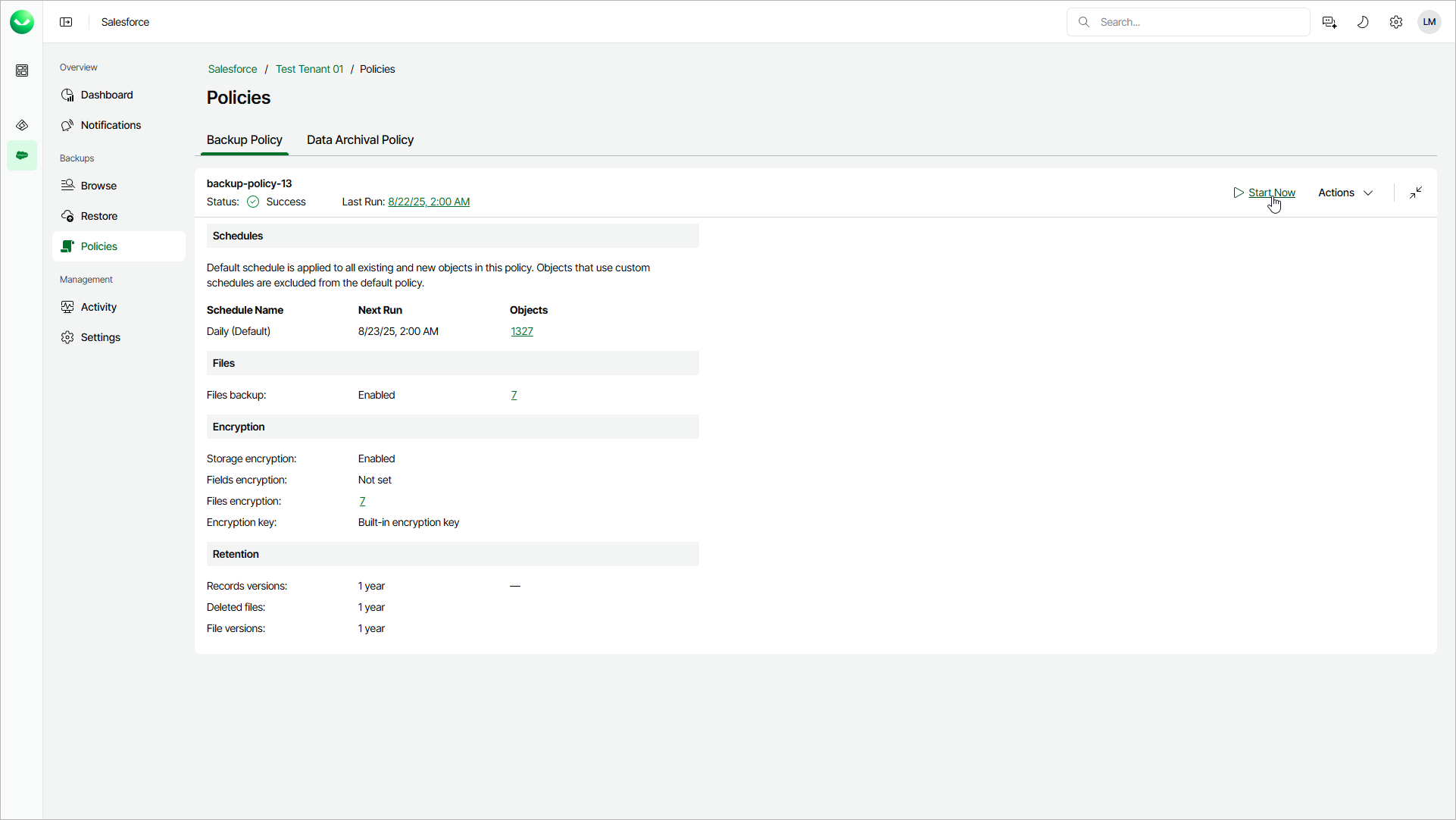 If you want to start the backup policy because some Salesforce data was not backed up, consider reloading object fields or metadata instead. For details, see Reloading Fields and Files and Reloading Metadata. |