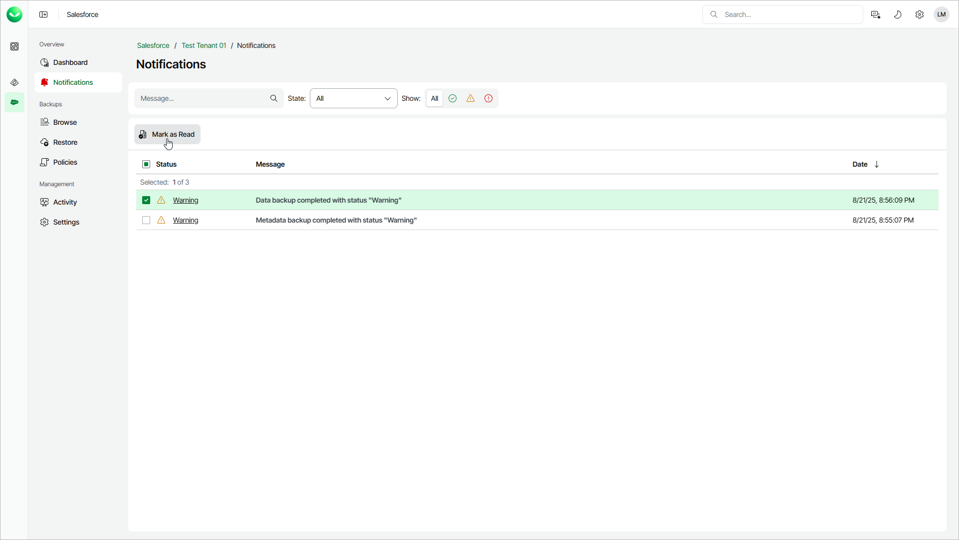 Veeam Data Cloud allows you to view the history of notifications and notification details. The retention period for notifications is 30 days. After this period, Veeam Data Cloud automatically deletes the notifications. You can configure notification settings for each Salesforce tenant. For details, see Managing Notifications.