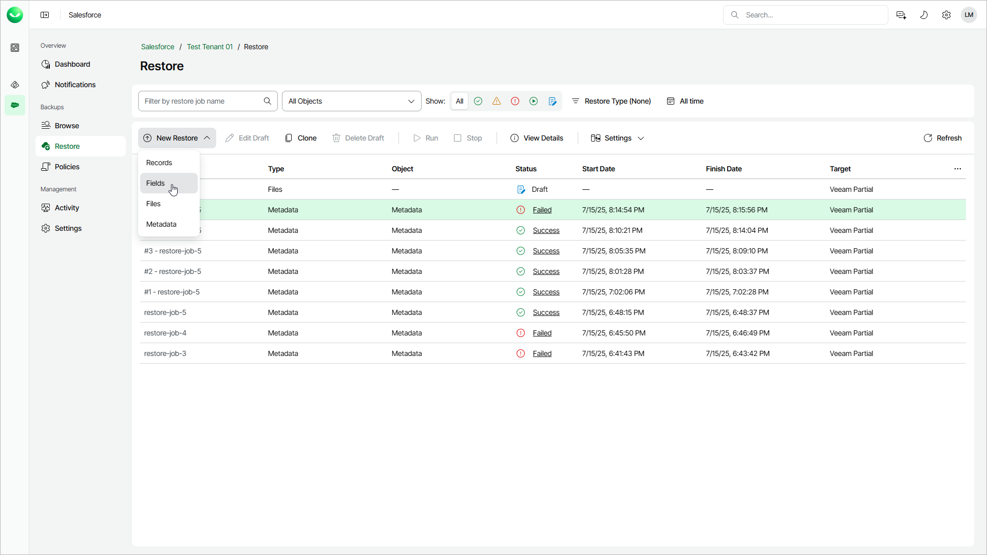 Step 1. Launch Restore Field Values Wizard To launch the Restore Field Values wizard:On the Salesforce page, click the name of the tenant you want to manage.To view all restore jobs created for the tenant, select Restore on the left.Select New Restore > Fields.