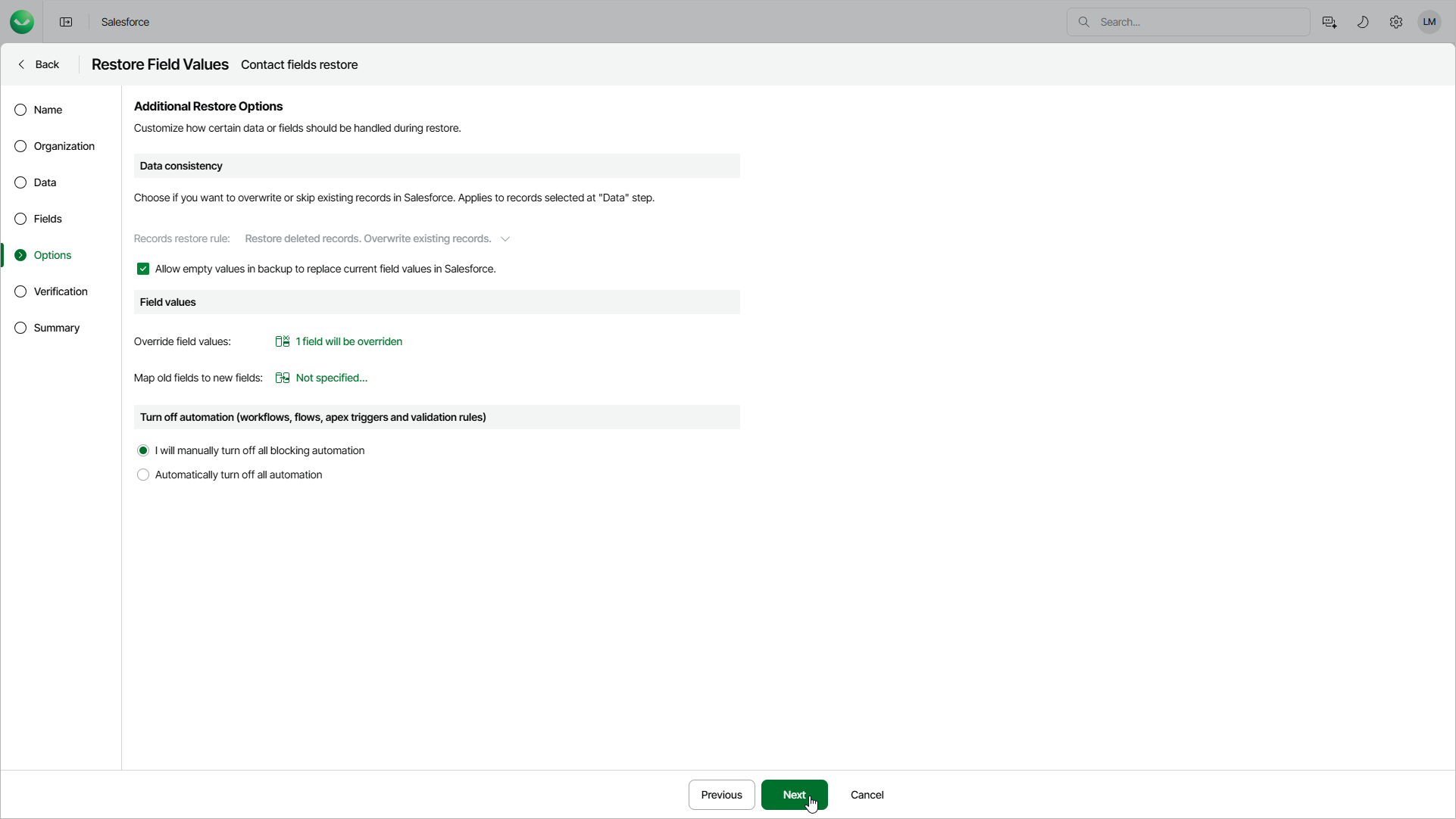 At the Options step of the wizard, you can instruct Veeam Data Cloud to automatically replace current field values in Salesforce with null, overwrite field values manually, map fields of backed-up records to specific fields in Salesforce, and choose the way you want to deactivate blocking automation in Salesforce.