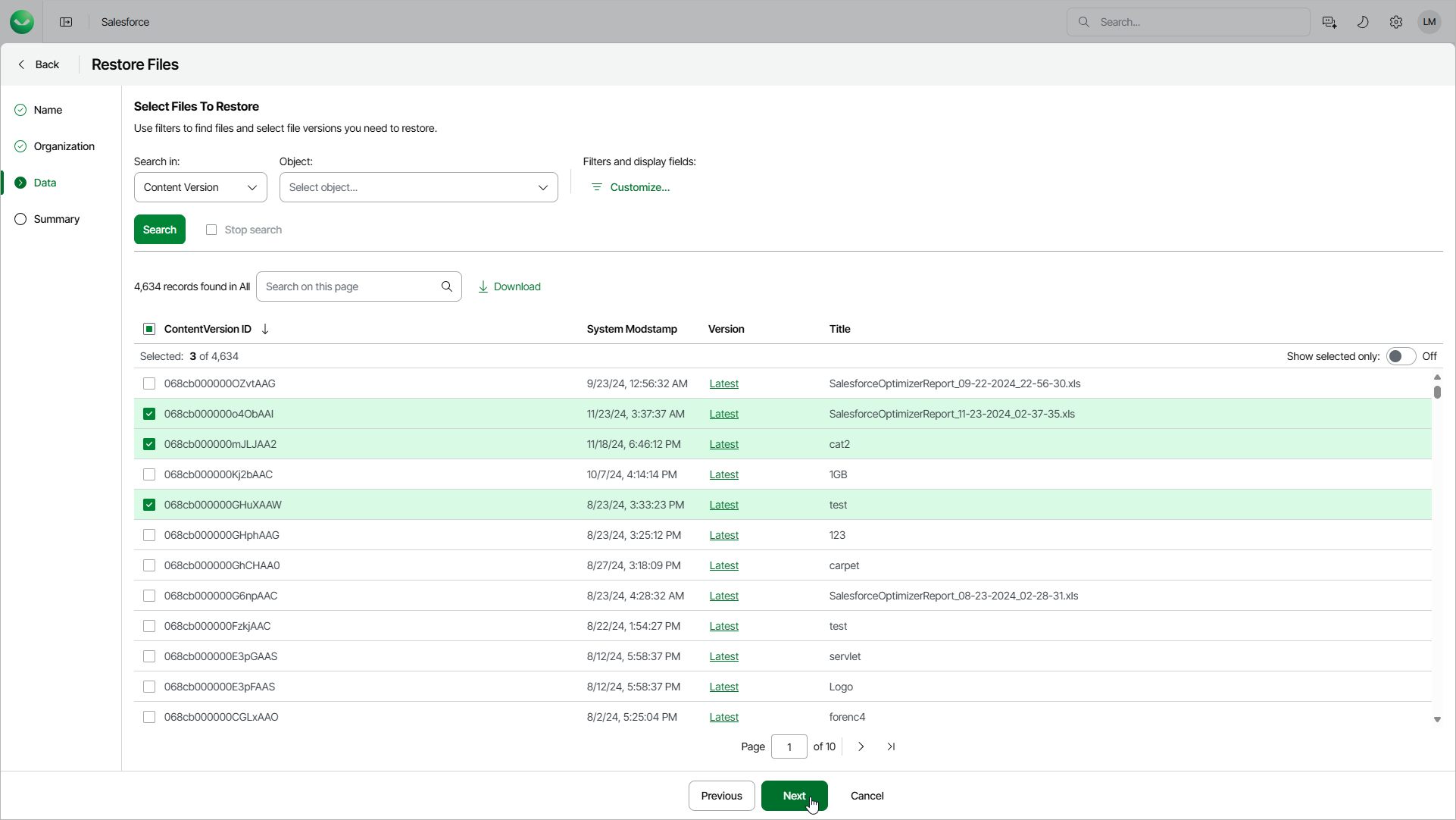 - If you select the ContentVersion file type, you will be able to choose the version of each file that will be restored — to do that, click the link in the Version column and select the necessary file version from the Restore point drop-down list.