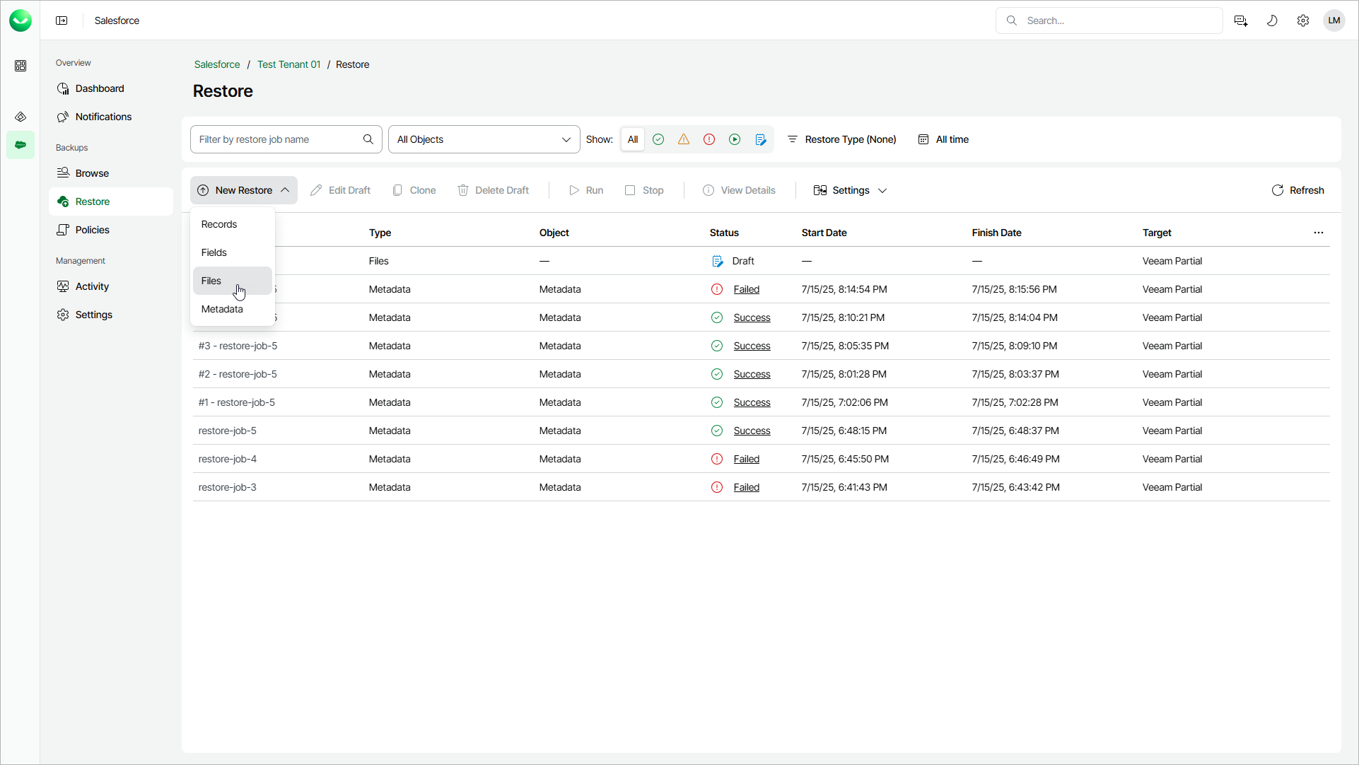 Step 1. Launch Restore Files Wizard To launch the Restore Files wizard:On the Salesforce page, click the name of the tenant you want to manage.To view all restore jobs created for the tenant, select Restore on the left.Select New Restore > Files.