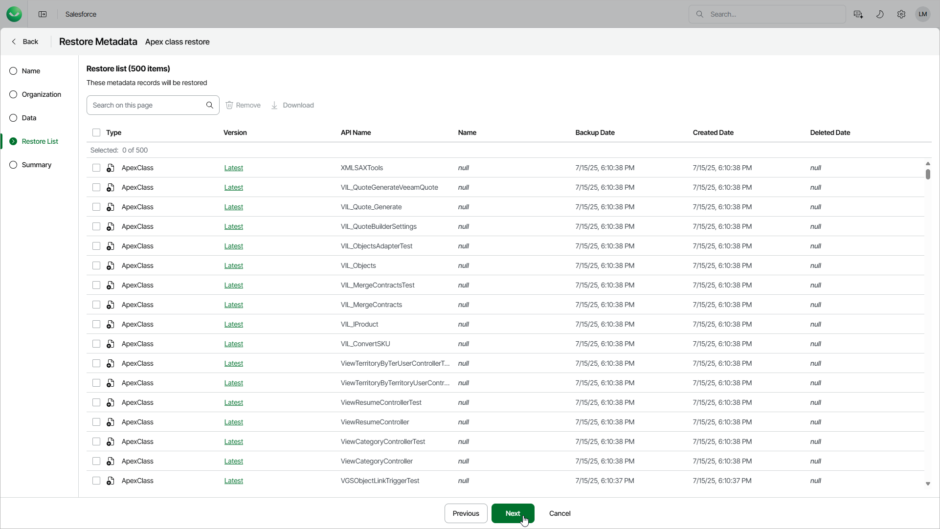 At the Restore List step, review the list of items that you want to restore and proceed with the wizard. To remove some of the metadata items from the restore job, select the items and click Remove.