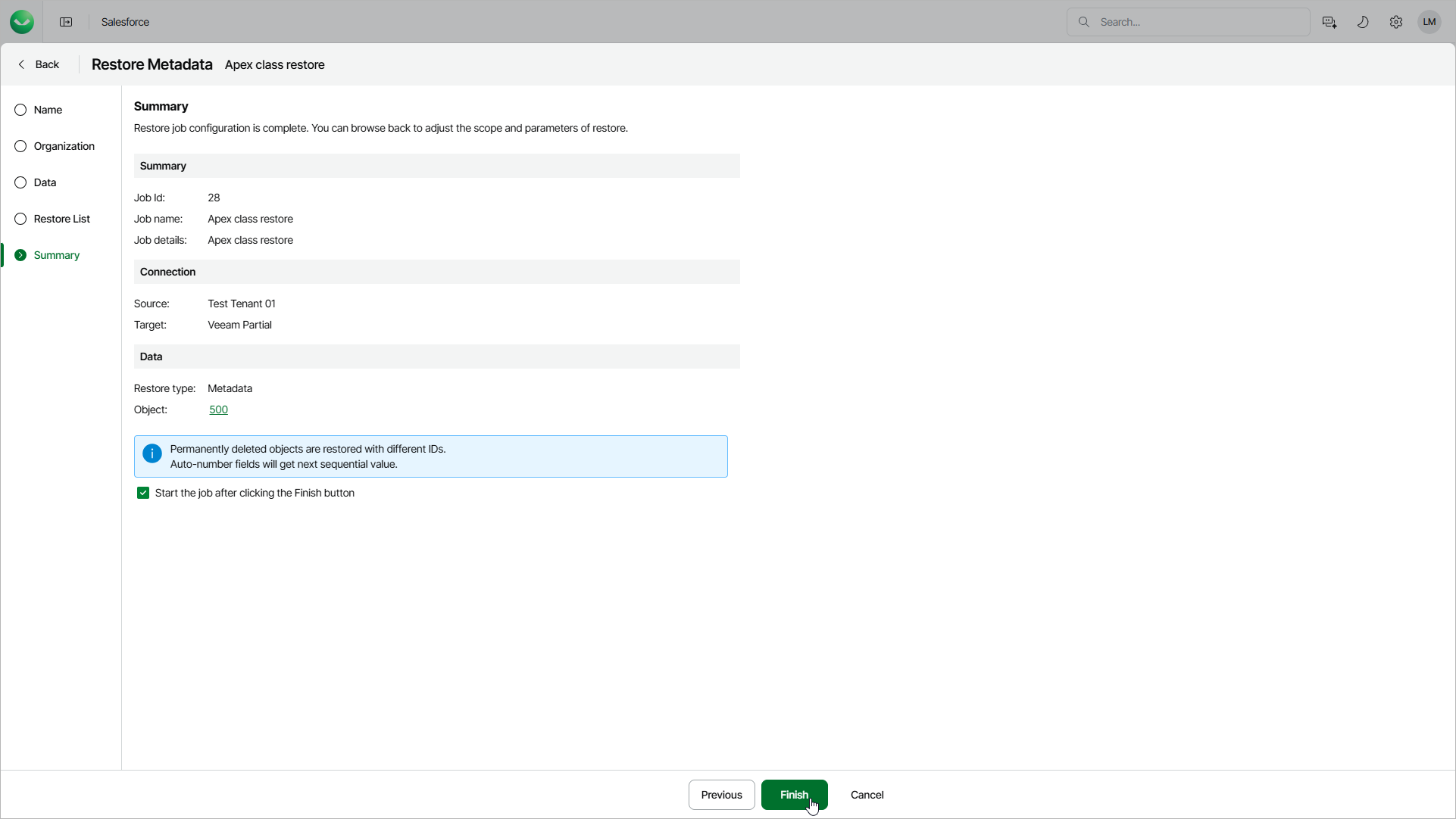 If you want Veeam Data Cloud to start restore automatically after you complete the wizard, select the Start the session after clicking the Finish button check box. Otherwise, the session draft will be created, and you will have to manually run the session as described in section Starting and Stopping Restore Jobs.