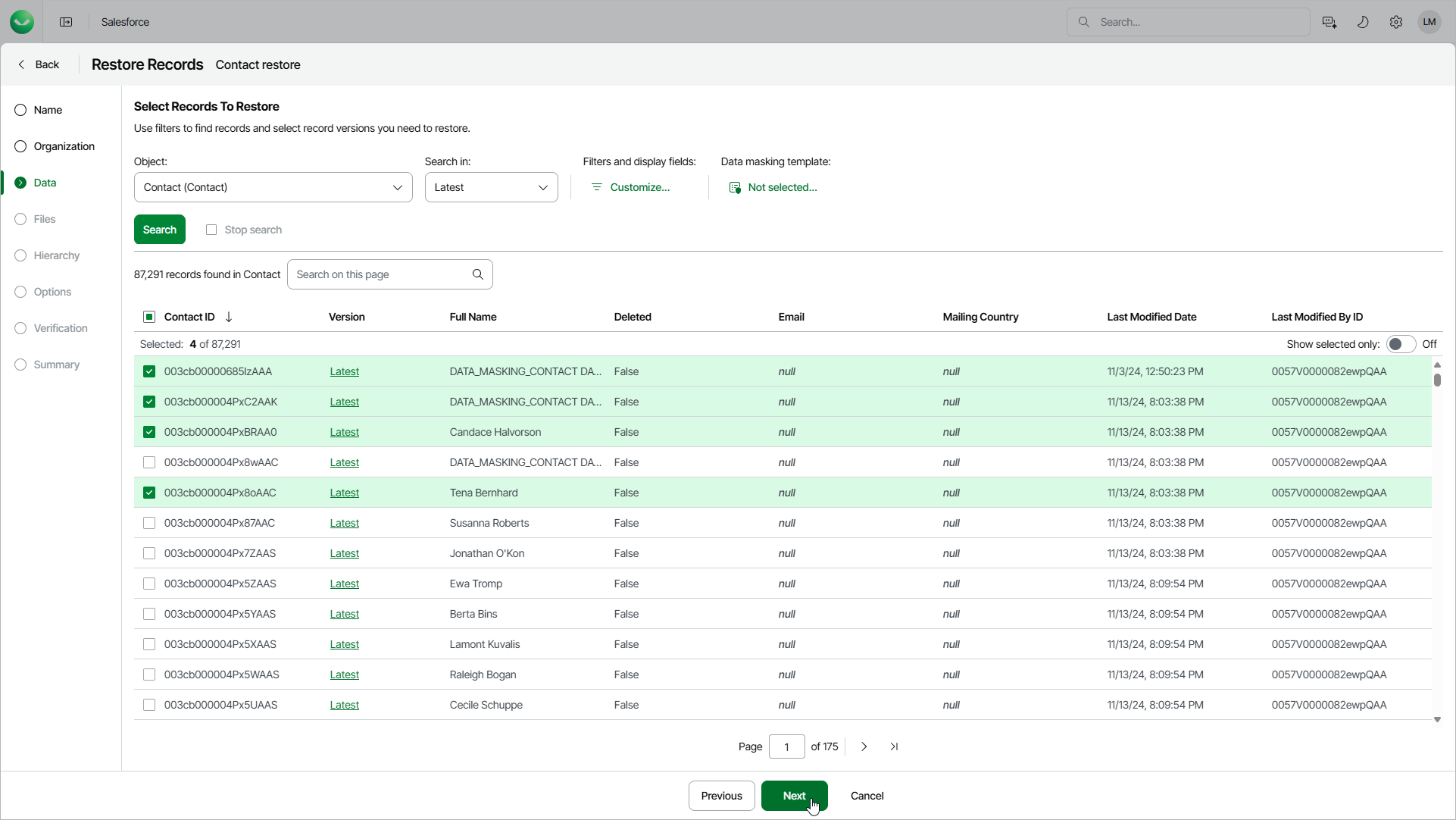 - Select the records that you want to restore. You can select up to 500,000 records for one restore job.
