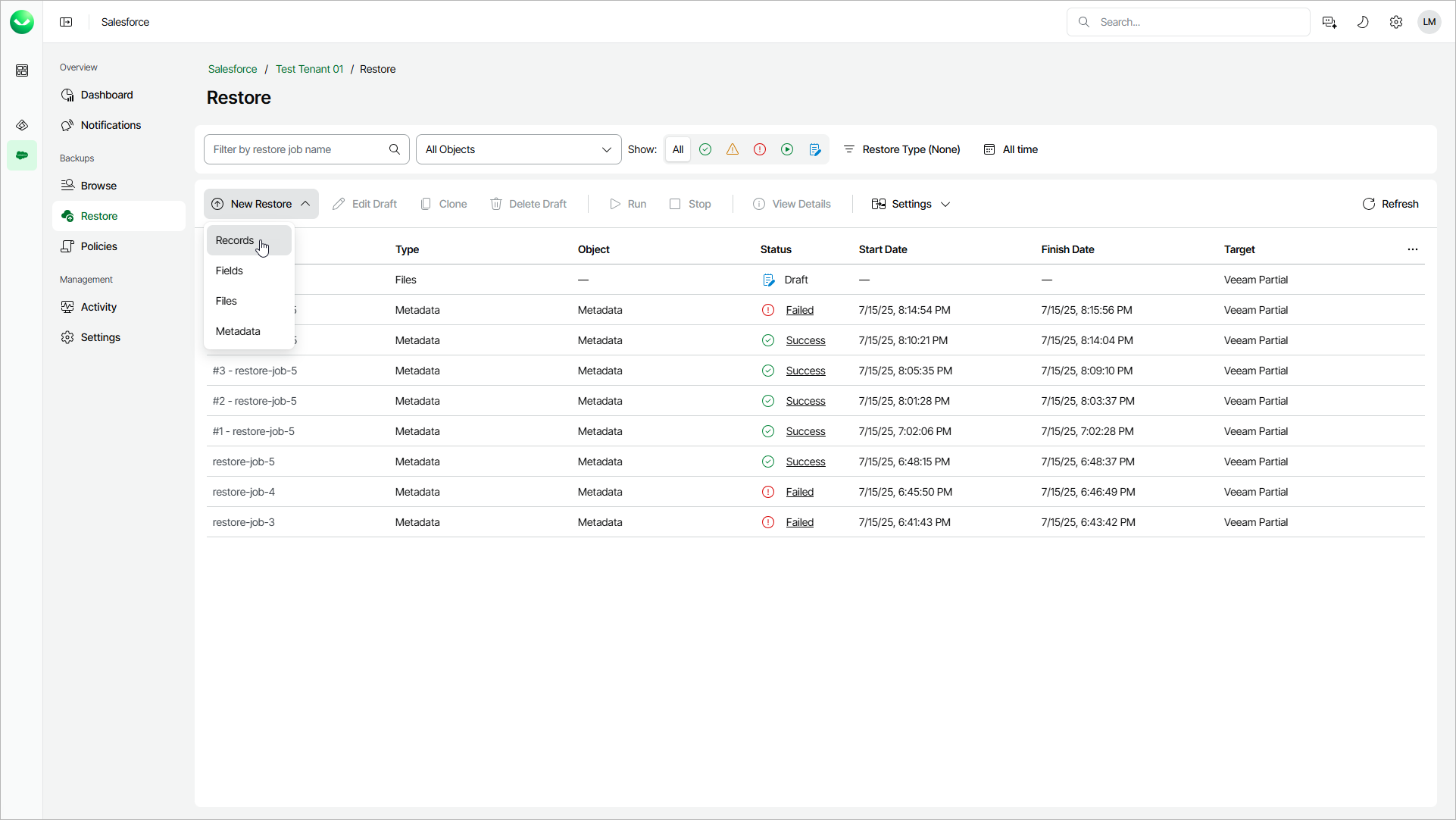 Step 1. Launch Restore Records Wizard To launch the Restore Records wizard:On the Salesforce page, click the name of the tenant you want to manage.To view all restore jobs created for the tenant, select Restore on the left.Select New Restore > Records.