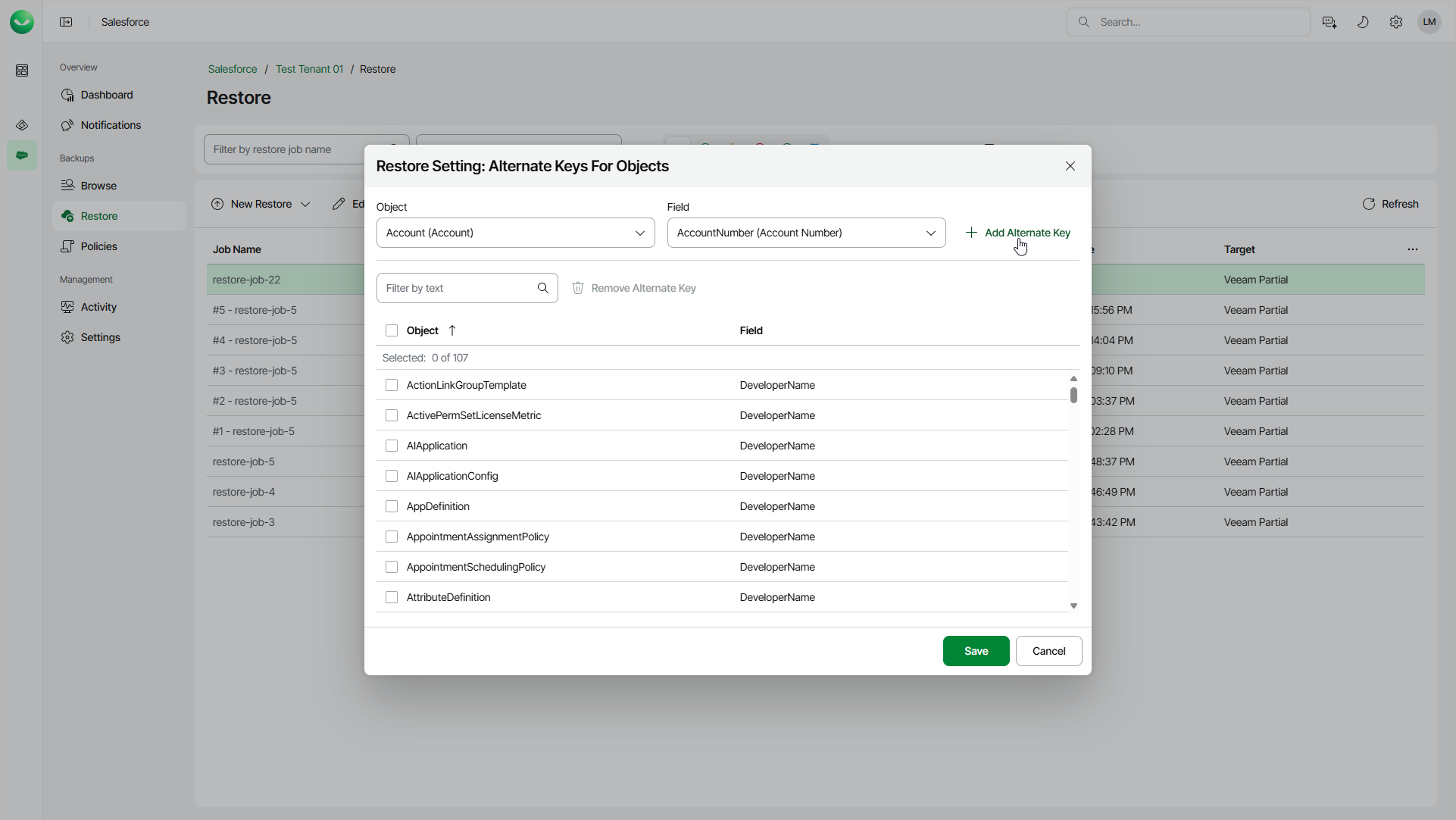 When restoring a Salesforce record, Veeam Data Cloud checks whether the record already exists in Salesforce. By default, the product uses the ID of the record saved in the backup to search for the record. However, you can add an alternate key and instruct Veeam Data Cloud to use this key instead of the record ID, that is, define a record field with a unique value that will be used to identify the restored record in case the product fails to find it by the record ID. For example, you can create a mapping rule and instruct the product to use a phone number or an email field instead of the default record ID.
