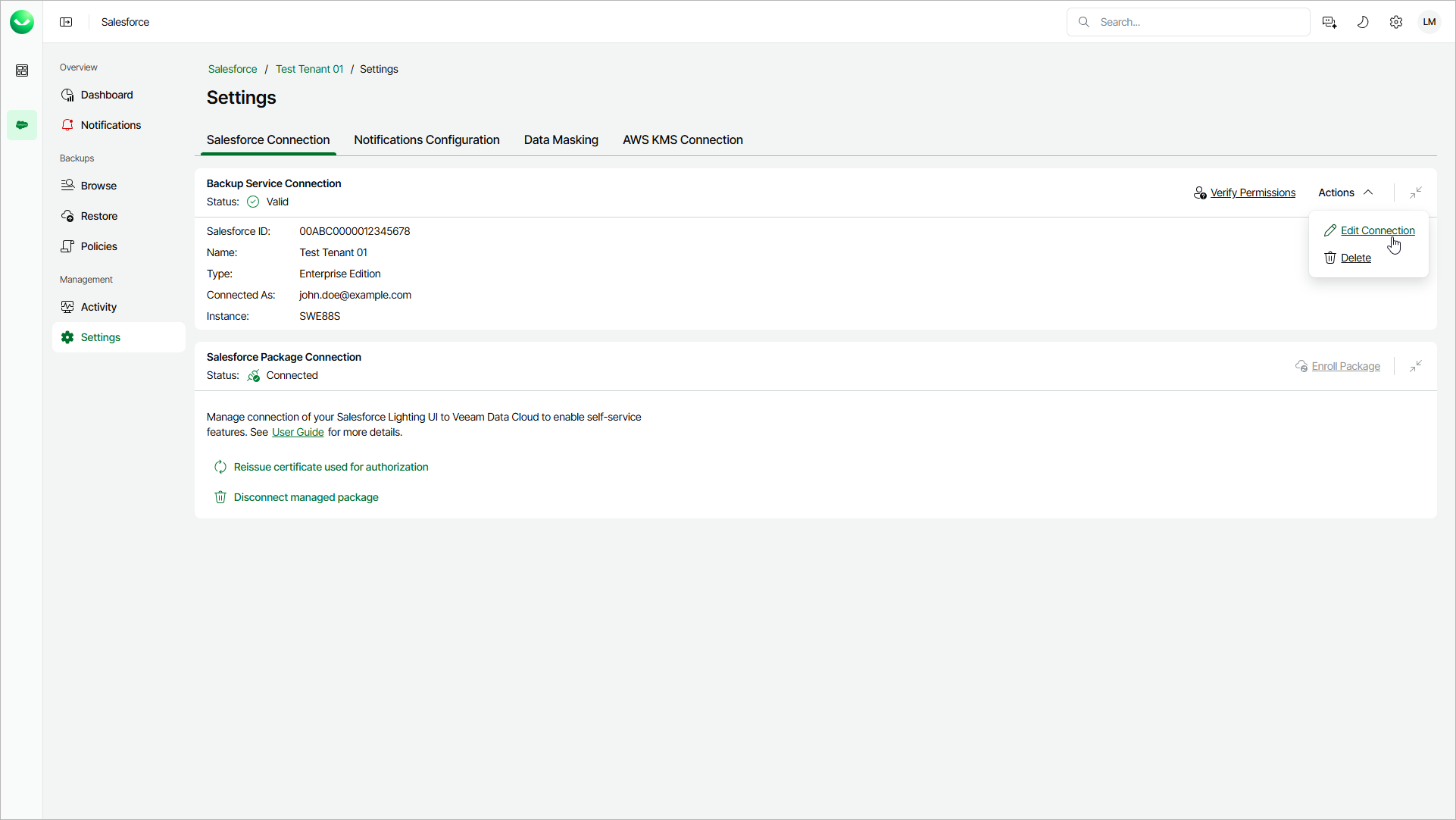 You may need to edit a backup service connection when you want to change the user that Veeam Data Cloud uses to connect to your Salesforce tenant. You can also verify whether the account has sufficient permission to perform backup operations.