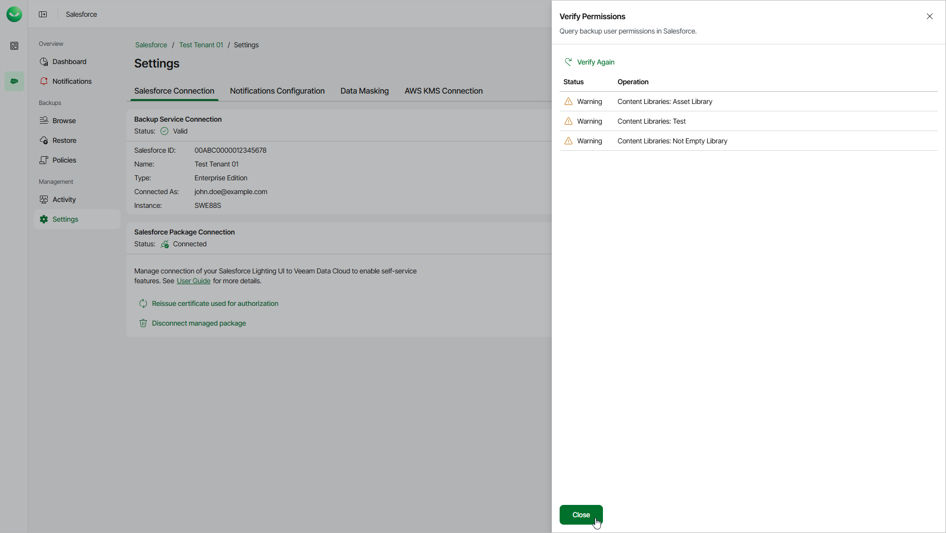 - Click Verify Permissions and wait for the check to complete. If any of the permissions are missing, you must grant them in the Salesforce console manually as described in Salesforce Documentation.