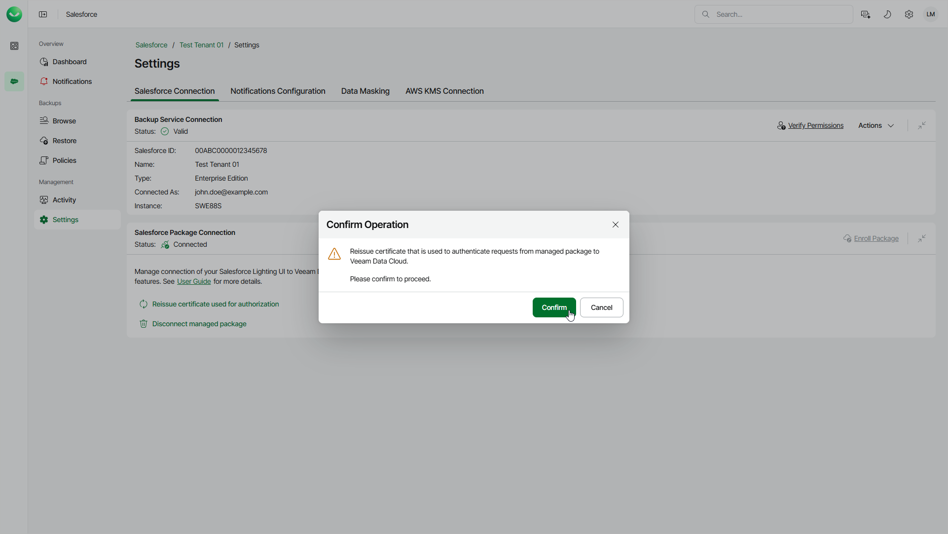 If the certificate that is used to authenticate requests from the Salesforce extension to Veeam Data Cloud expires or it is revoked, you may need to reissue it.