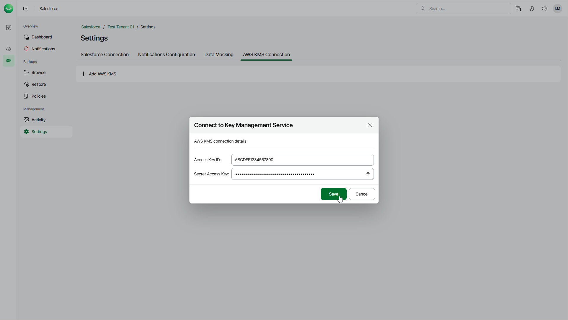To add a connection to the AWS Key Management service, do the following:
