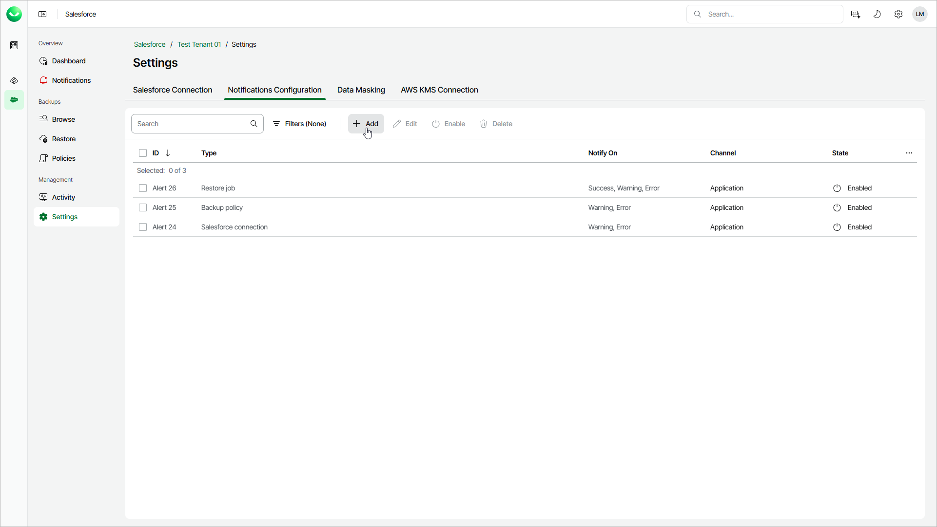 Step 1. Launch Add Notification Wizard To launch the Add Notification wizard, do the following:On the Salesforce page, click the name of the tenant you want to manage.Select Settings.Select the Notifications Configuration tab.Click Add.