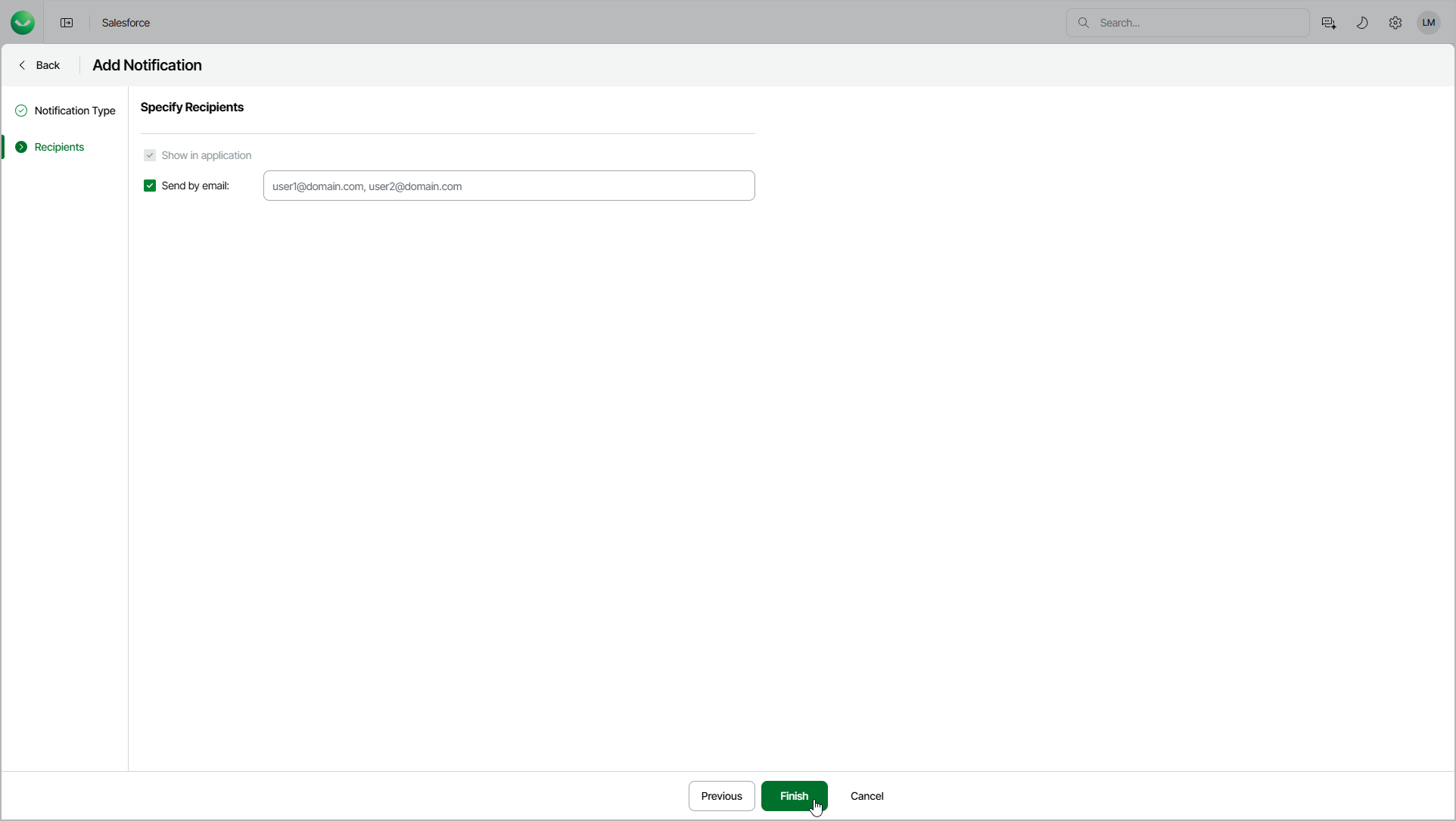 At the Recipients step of the wizard, you can specify a list of email addresses that will receive messages with this notification. By default, Veeam Data Cloud only displays notifications in the Notification and Dashboard sections for all users that have access to your Salesforce tenant.
