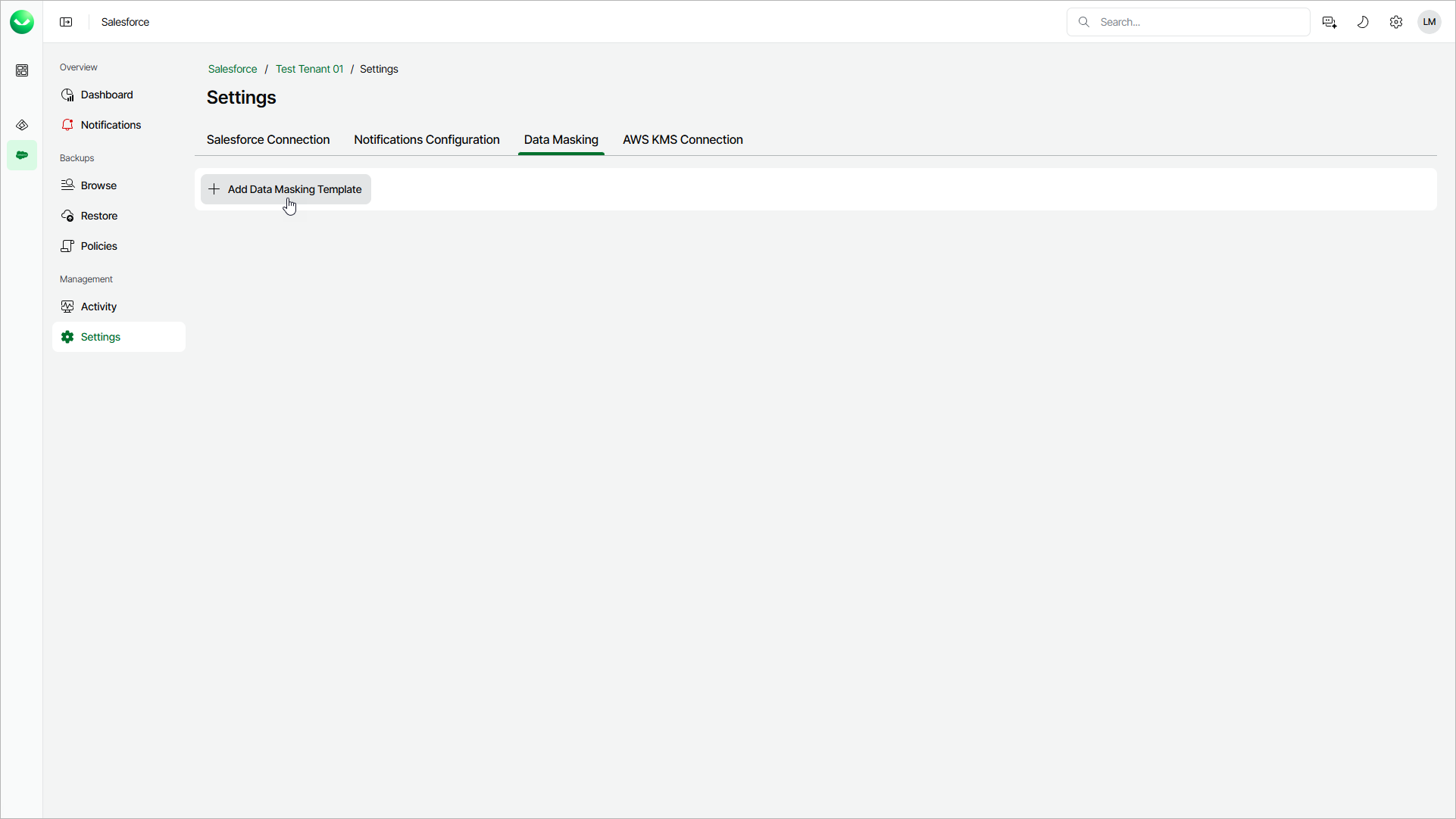 Step 1. Launch Add Data Masking Template Wizard To launch the Add Data Masking Template wizard, do the following:On the Salesforce page, click the name of the tenant you want to manage.Select Settings.Select the Data Masking tab.Click Add Data Masking Template.