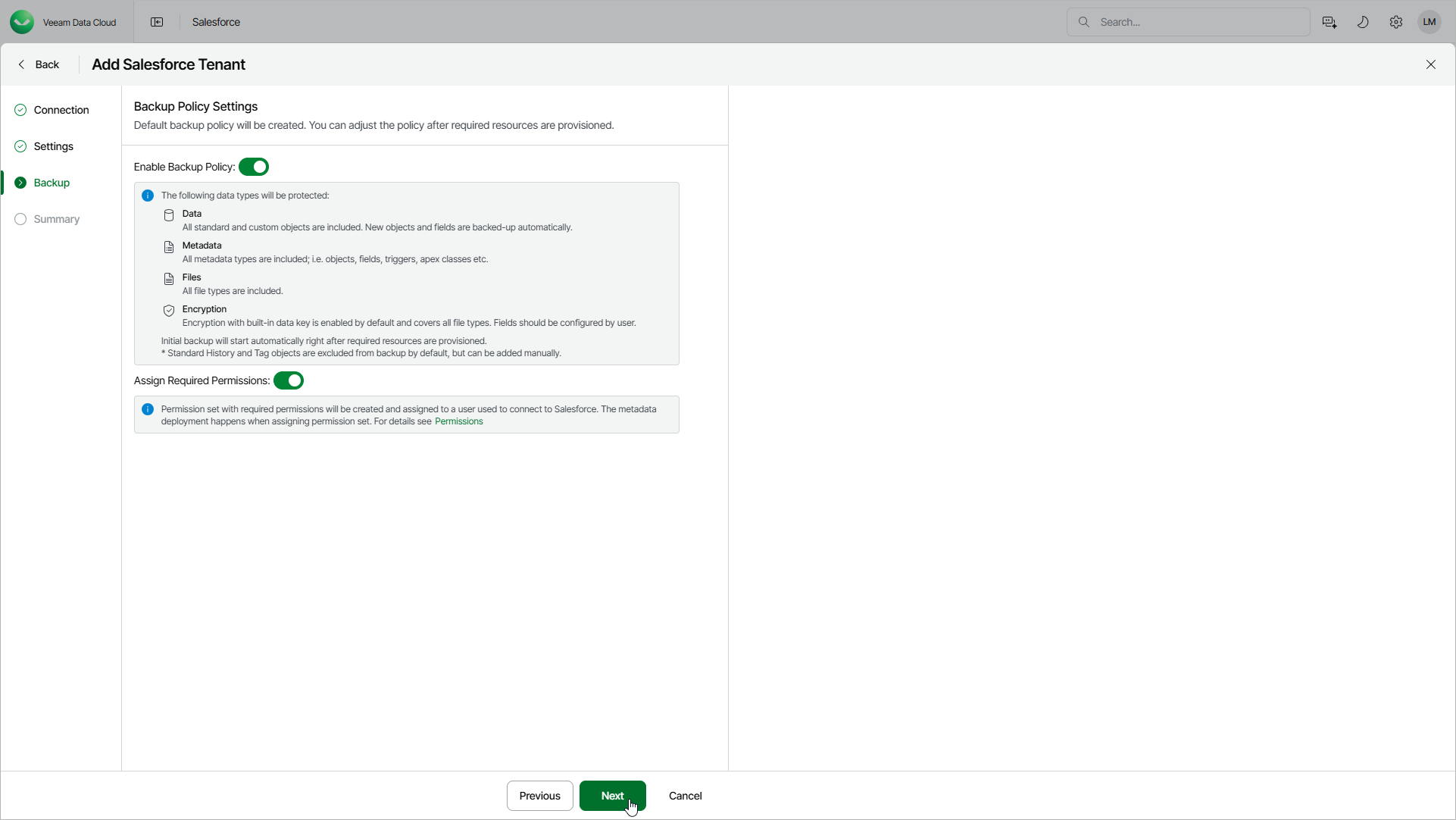 To back up and restore Salesforce data, the user that Veeam Data Cloud uses to connect to the Salesforce tenant must be assigned a set of permissions. To allow Veeam Data Cloud to automatically assign the permissions, select Assign Required Permissions. For more information on the required permissions, see Permissions.