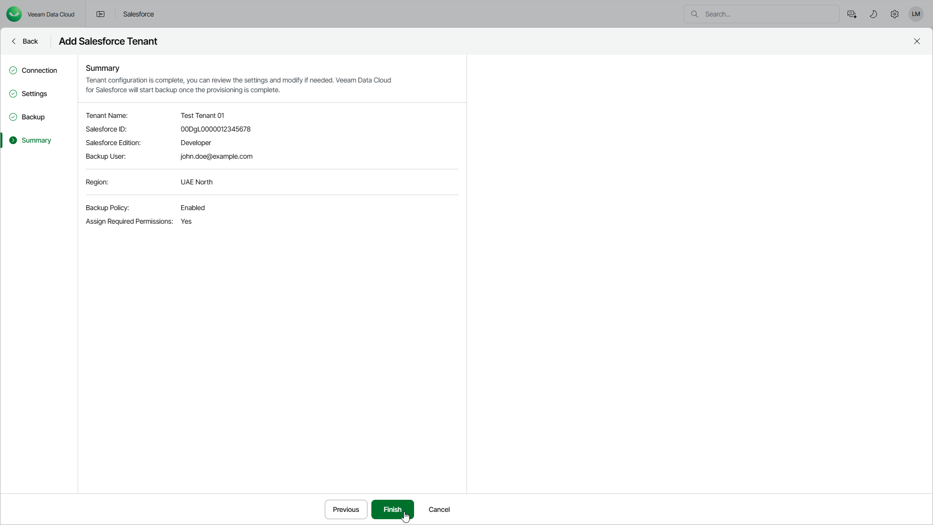 At the Summary step of the wizard, review your settings and click Finish to start provisioning the new Salesforce tenant. Provisioning the first Salesforce tenant in the selected Microsoft Azure region may last up to 10 minutes. You will receive an email notification once provisioning is completed.