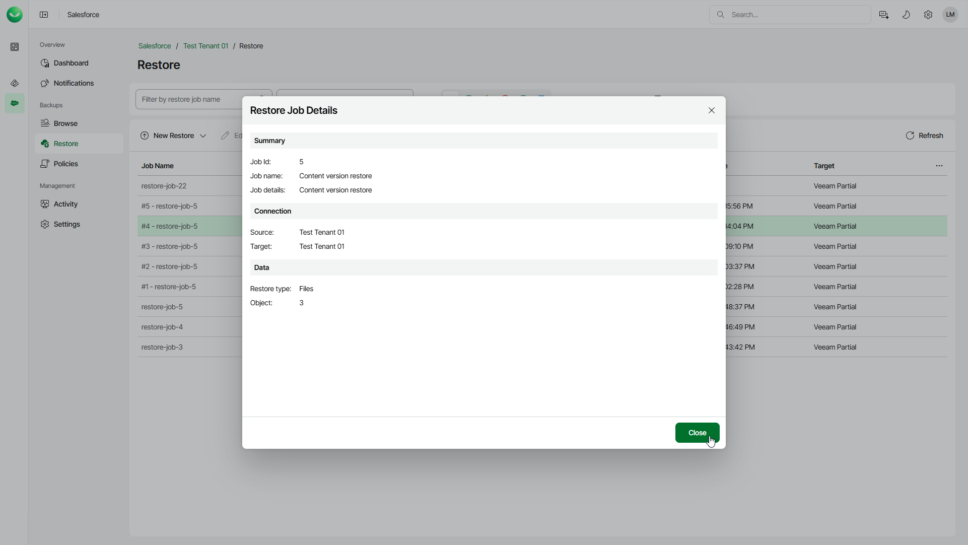 - To view all restore jobs created for the tenant, select Restore on the left.