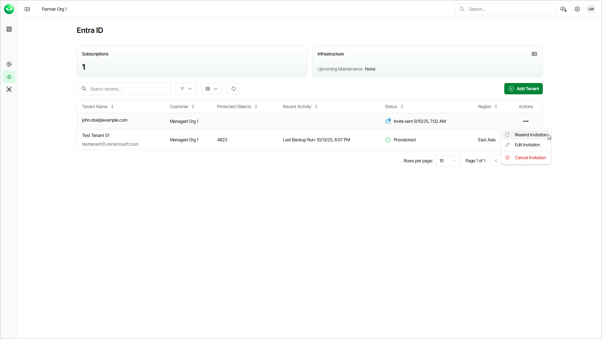 - In the tenant list, click the menu in the Actions column of the tenant whose invitation you want to resend and select Resend Invitation.