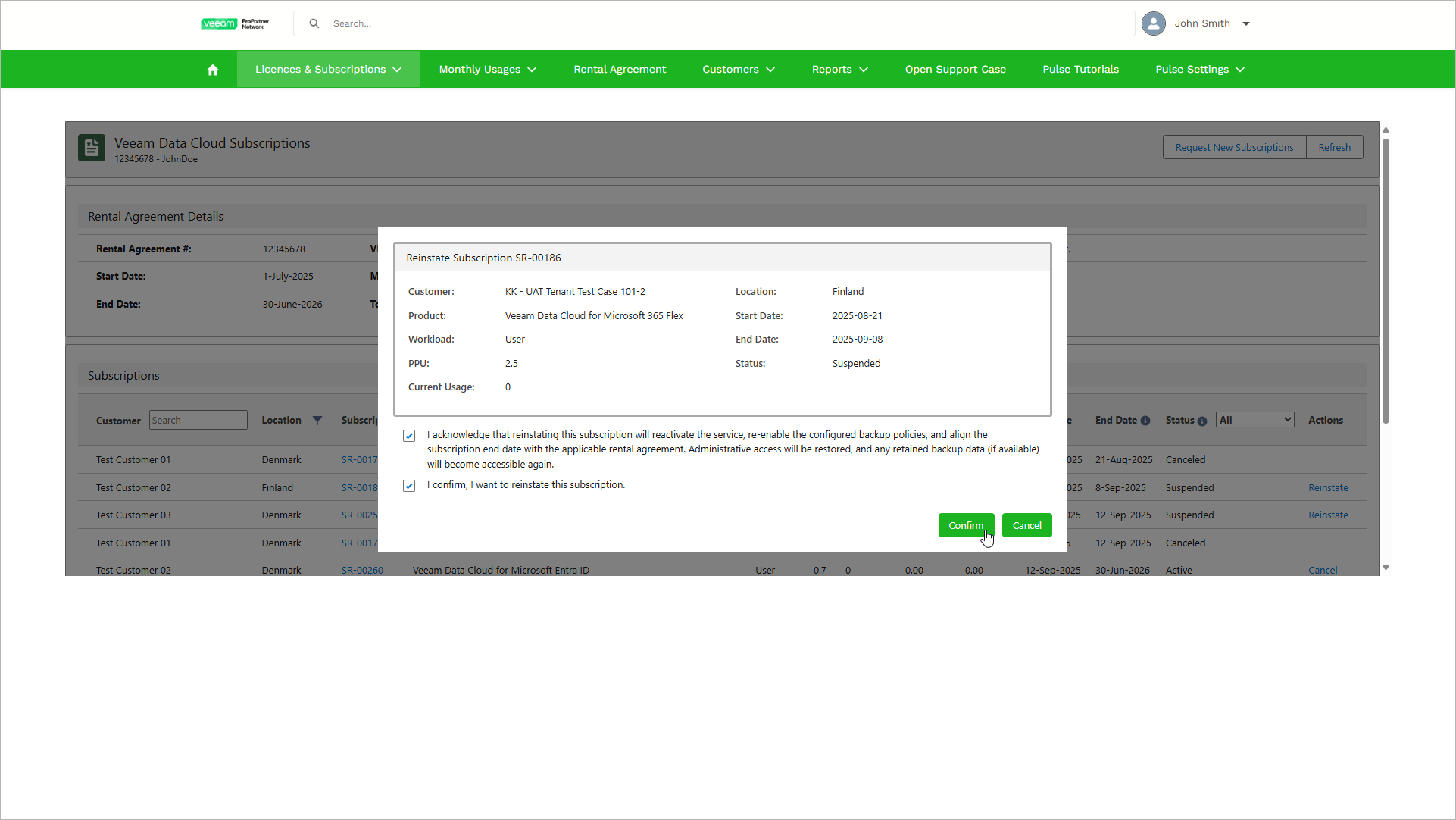 - In the Reinstate Subscription window, select both check boxes to acknowledge the required changes and confirm the reinstatement.
