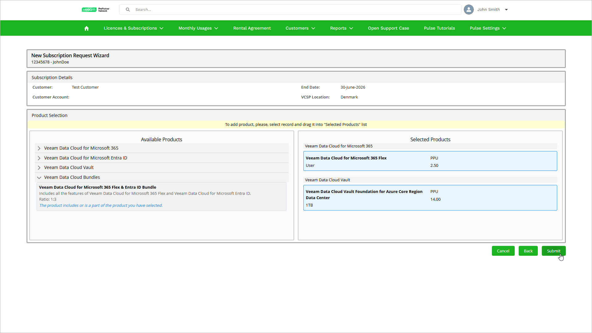 At the Product Selection step of the wizard, add subscription products and bundles that you want to include in the new subscription request. If the customer has an active subscription for a specific licensing product, you cannot request another subscription for that product or a subscription bundle that includes the same product. To request a new subscription for a product, cancel the customer active subscription with the same product first. For details, see Canceling Subscriptions.