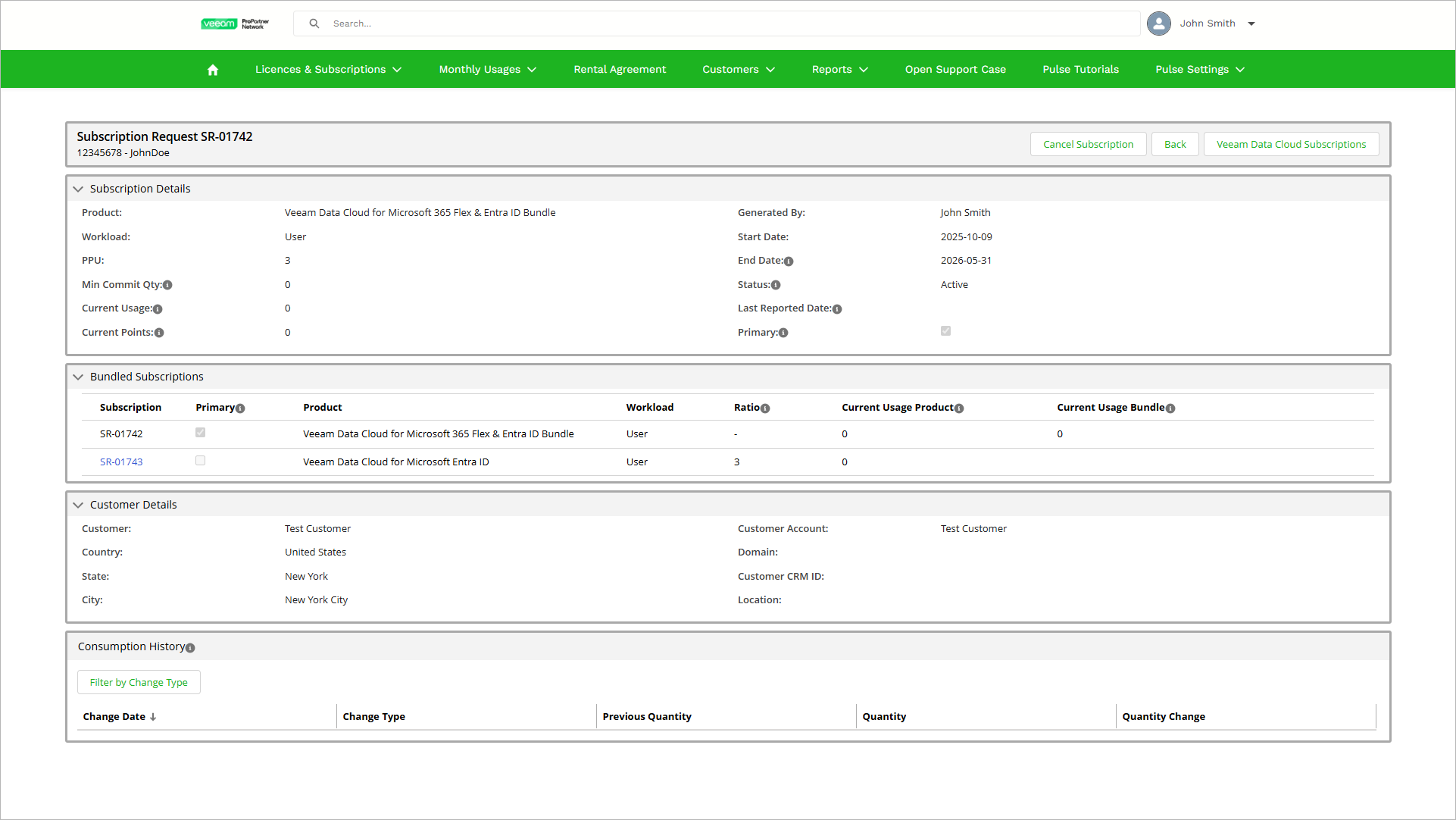 The Subscription Request page is divided into several sections that contain detailed information on subscription properties, the assigned customer and consumption history.