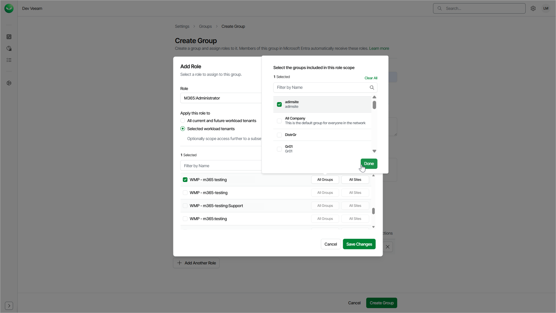 • If you select Admin, you cannot assign additional roles. This role grants access to all workloads and tenants. The group members can manage users and perform all configuration actions, backup and restore operations.