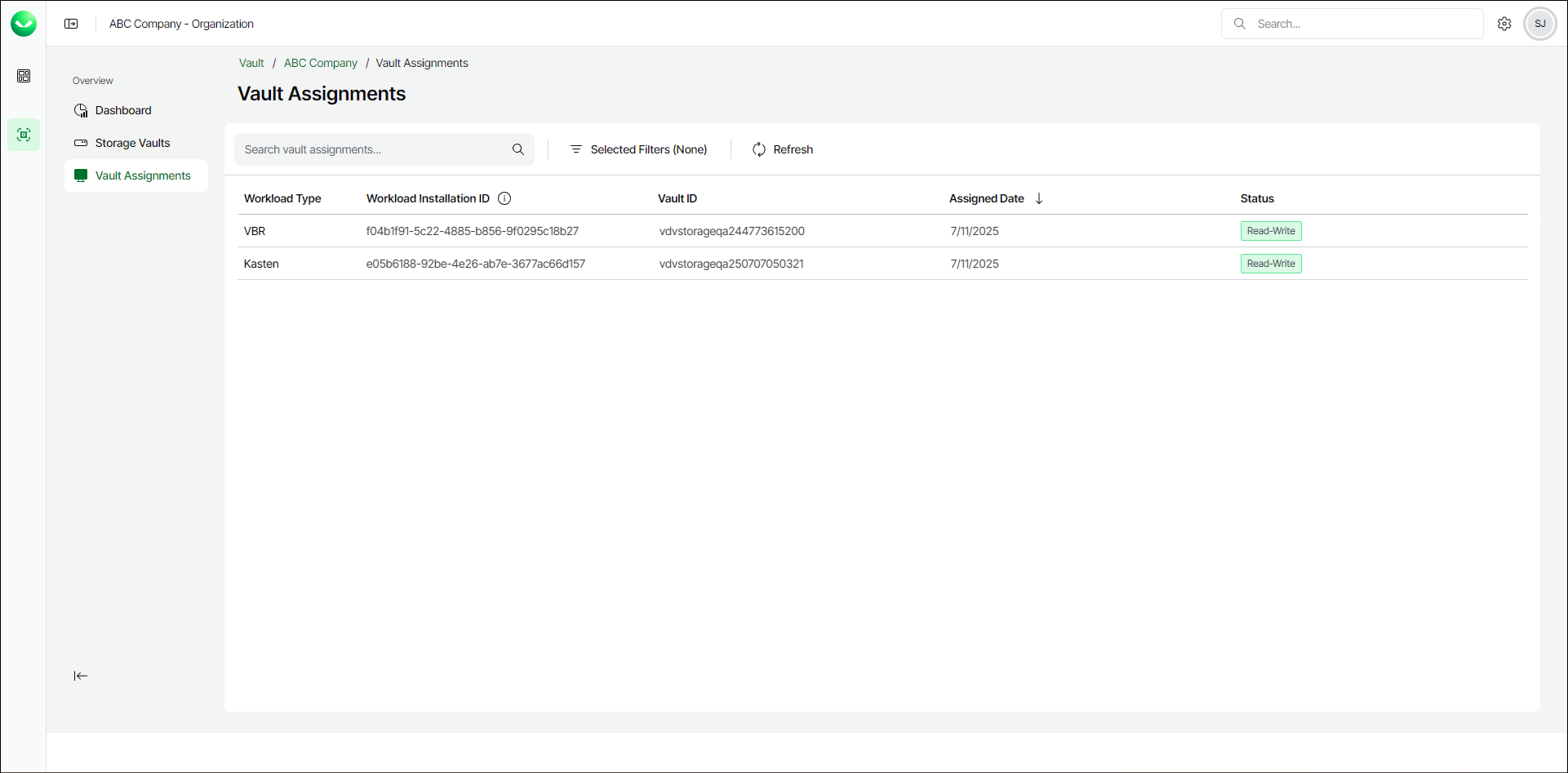 - On the Vault Assignments page, view the list of integrations.