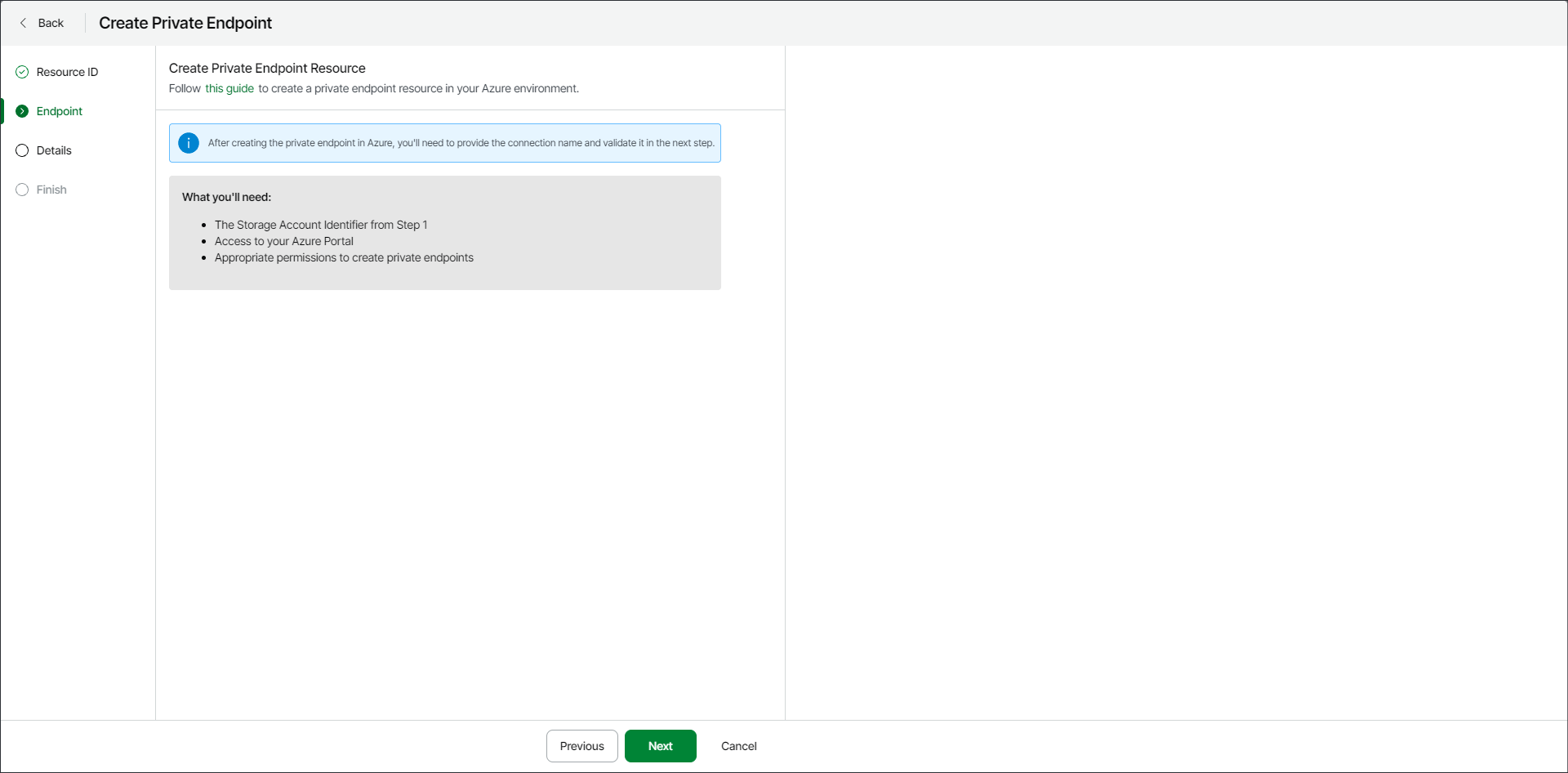 At the Endpoint step of the wizard, click this guide and follow the instructions to create a private endpoint resource in the Azure portal.