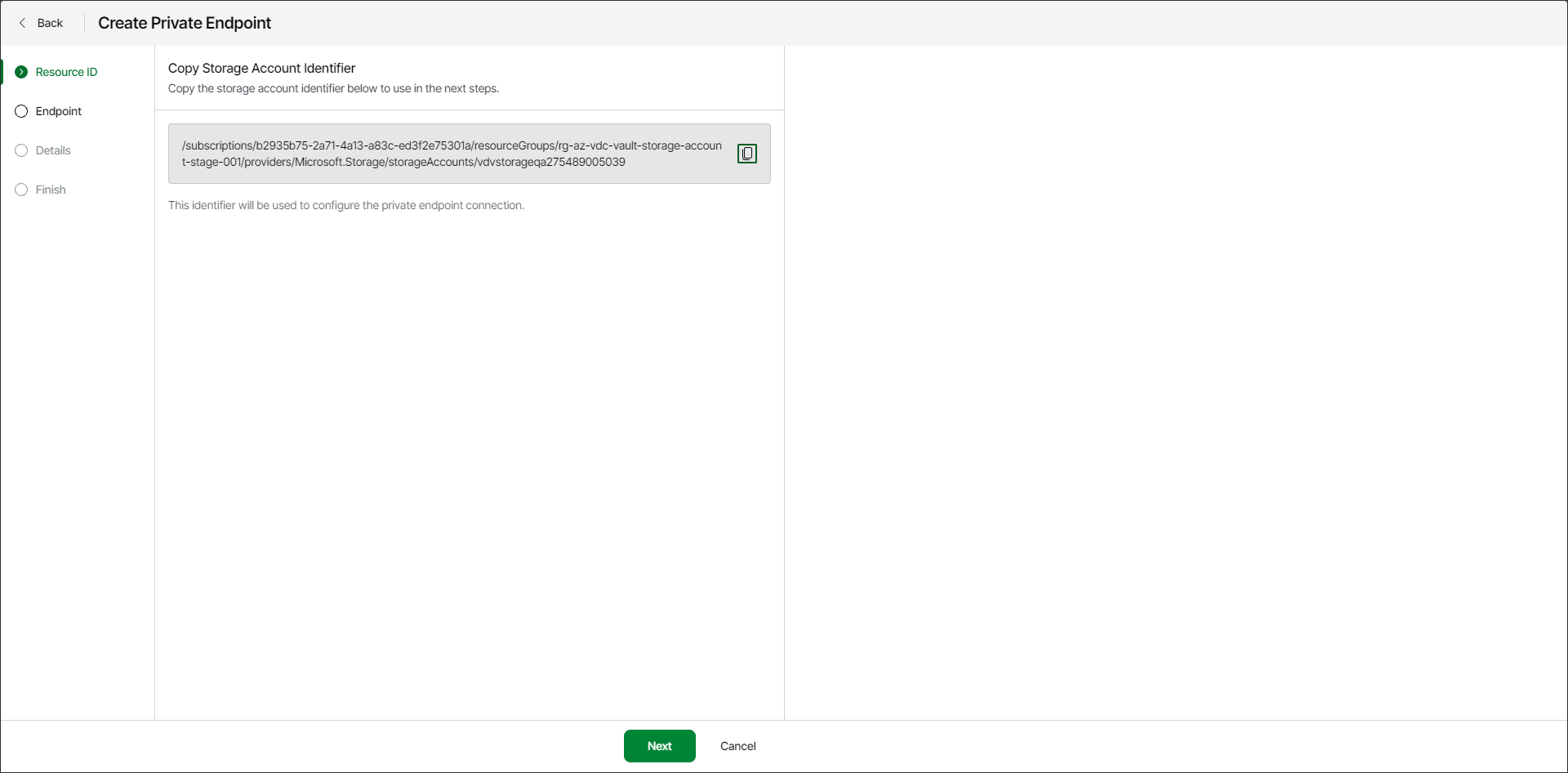 Step 2. Copy Resource ID At the Resource ID step of the wizard, click the copy icon next to the storage account identifier to copy the storage ID.You will use the identifier in the next step to create the private endpoint resource.