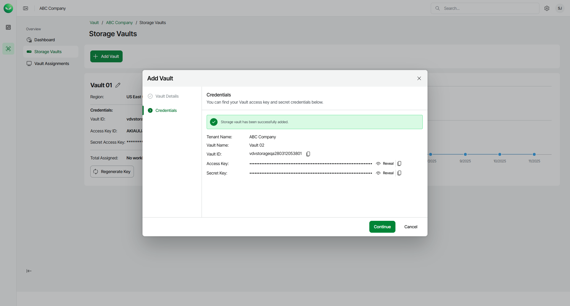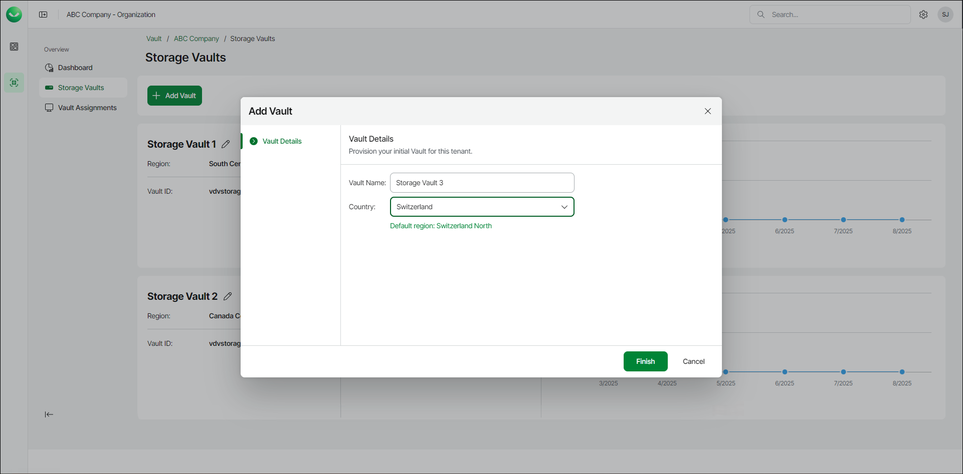 The first storage vault is created as part of onboarding a new Vault tenant. You can add new storage vaults later, for example, if you need to increase storage size or want to store data in another region.