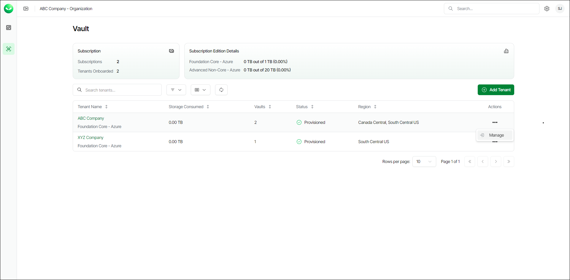 - Click the button with three dots at the end of the row, then click Manage. The dashboard page will open and you will be able to work with tenant resources. To learn more, see Viewing Dashboard and Working with Storage Vaults.