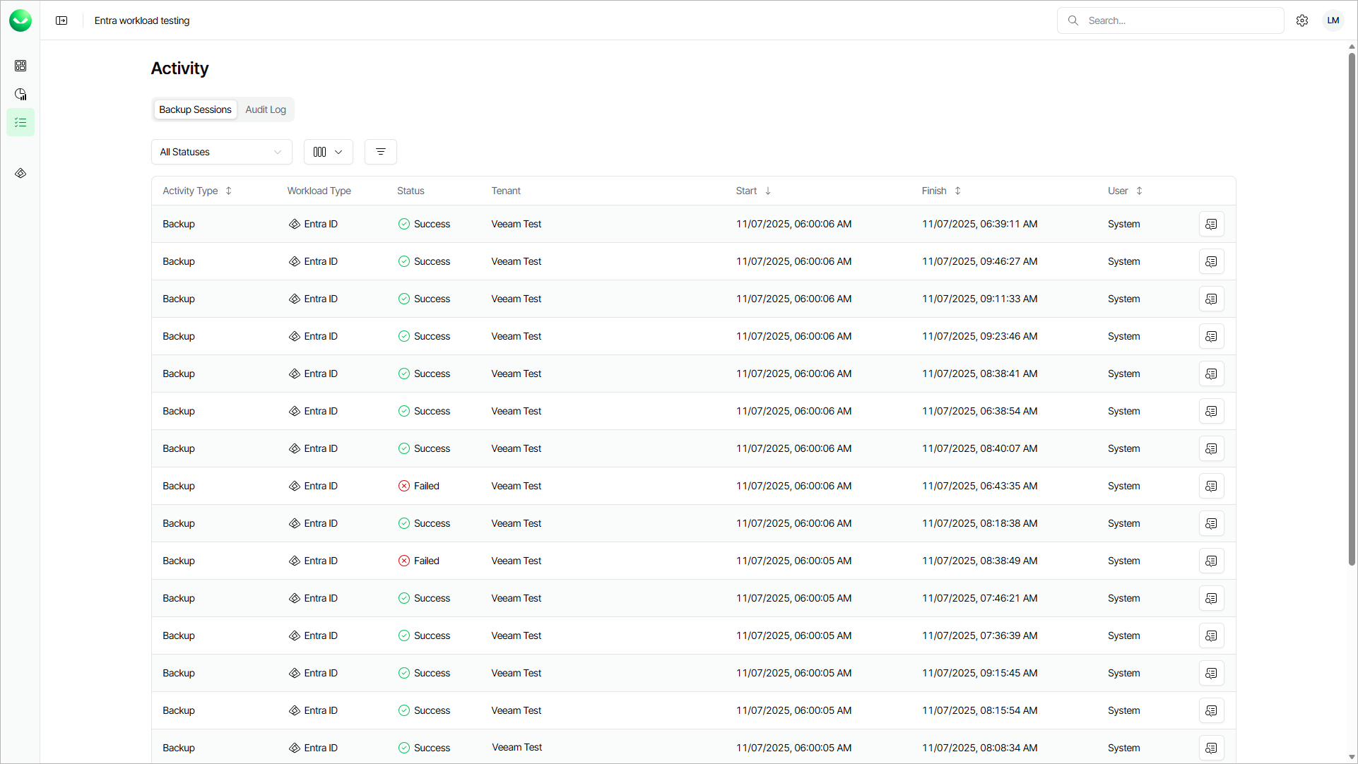For each data protection operation, Veeam Data Cloud starts a new backup session according to created backup policies. In the Activity view, you can review all running and completed backup sessions across all workloads within your Veeam Data Cloud organization. This helps you shorten your response time to issues and simplifies prevention and troubleshooting of potential problems.